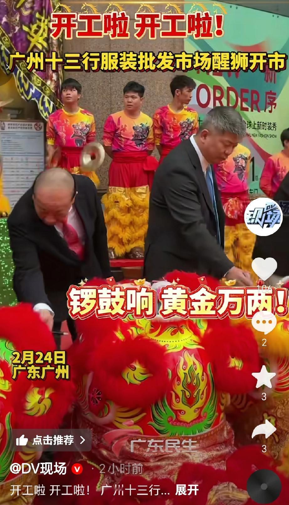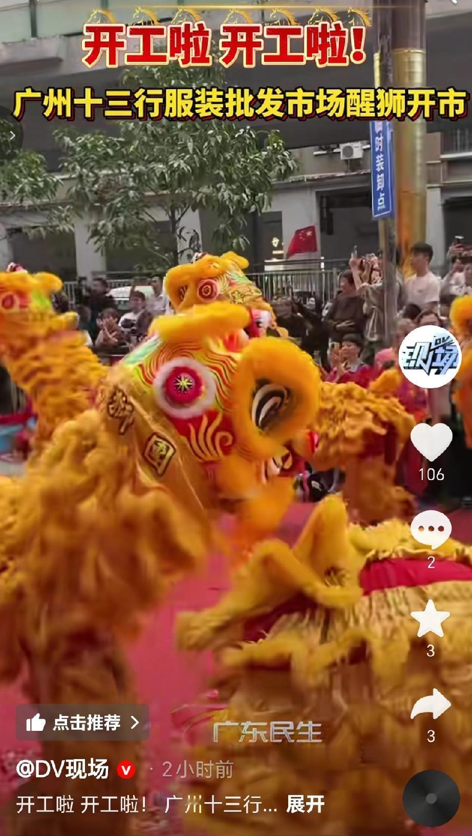 广州十三行服装批发市场(新中国大厦)于2026年2月24日(正月初八)正式开工开市,其八楼此前已于正月初七抢先焕新开市。开市仪式:延续广府传统,以醒狮开市为核心环节,醒狮采青、锣鼓助兴,祈愿新一年生意兴隆、客似云来,是广州商贸开市的经典标配。本次开市恰逢十三行八楼全新升级,2026春装新品集中上新,款式新潮且库存充足,开市现场人气爆棚,商户抢抓新春“第一单”。这也是广州商贸领域节后复工的重要缩影,醒狮开市的传统仪式也为批发市场迎来了开年的热闹氛围。(来源于@DV现场)