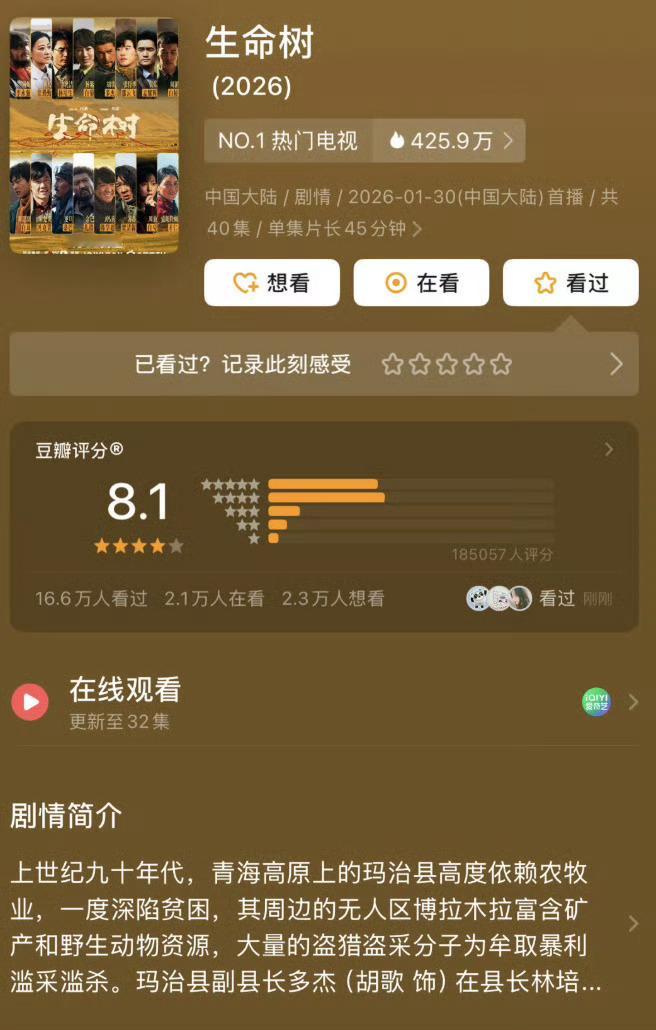 生命树豆瓣分数涨至8.3杨紫、胡歌《生命树》豆瓣分数涨至8.3,近27w人打分,