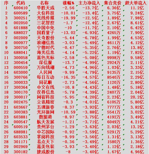 2月24日尾盘30分钟,主力“卖出的 ”30名单! 华胜天成:主力净流出 13.7亿元,集合竞价成交 6.36亿元 大位科技:主力净流出 13.4亿元,集合竞价成交 3.75亿元 光线传媒:主力净流出 12.5亿元,集合竞价成交 1.89亿元 三花智控:主力净流出 12.4亿元,集合竞价成交 2.67亿元 中国中免:主力净流出 11.7亿元,集合竞价成交 2.10亿元 国盾量子:主力净流出 6.93亿元,集合竞价成交 0.4265亿元