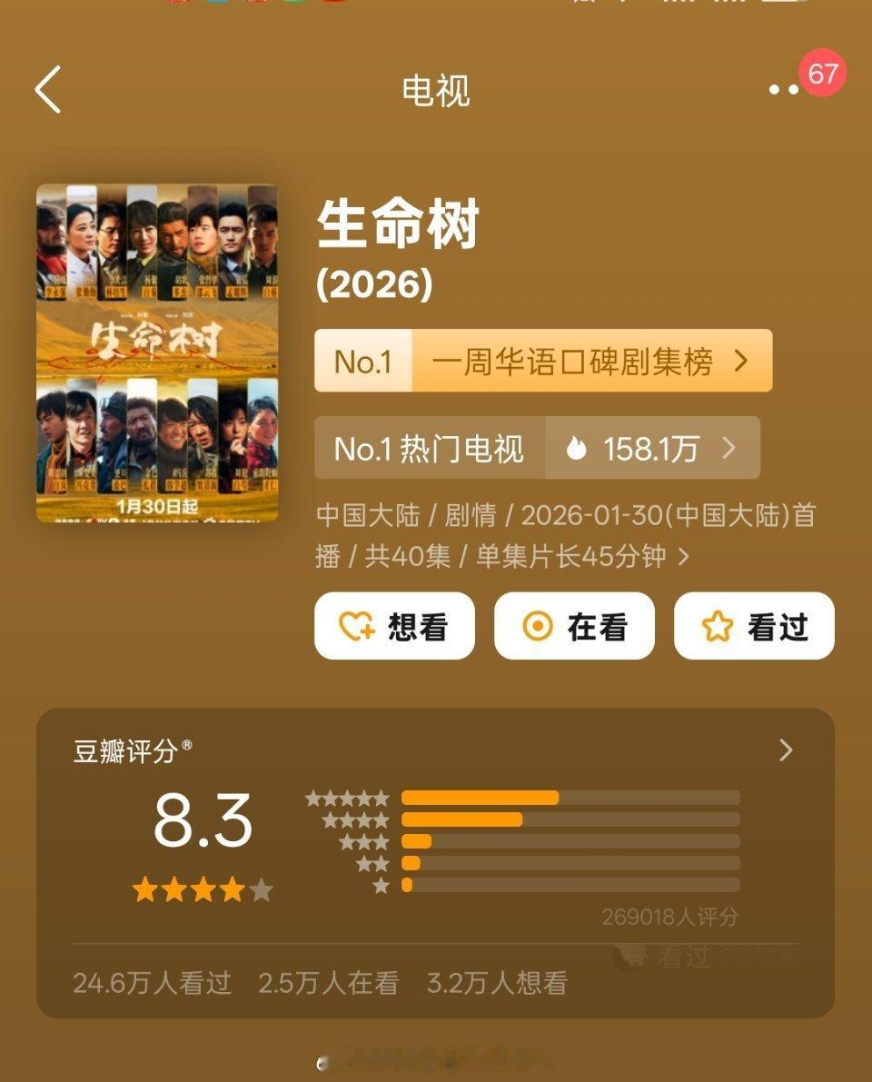 生命树豆瓣分数涨至8.3《生命树》开分十天即从8.1分上涨至8.3分,近27w人