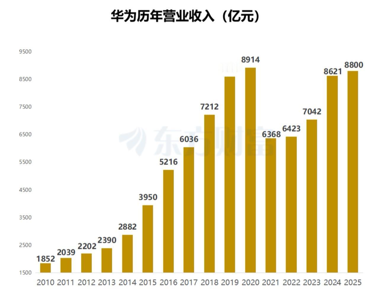 2025年华为营收超过8800亿,历史第二高,仅次于出售荣耀之前的2020年,绝对值差距也仅仅只有一百多亿了。 2026年,华为营收应该就能够见到历史新高。 一方面鸿蒙生态的快速成熟会有助于华为手机销量的回升,加大鸿蒙智行的大卖,今年终端的营收预计会有较大幅度的增长; 另一方面,AI建设带来昇腾芯片业务的快速增长也是可以预见的; 第三,汽车业务,包括引望和数字能源也会贡献较多的增量。 ICT基础设施业务这个压舱石保持稳定就可以了。