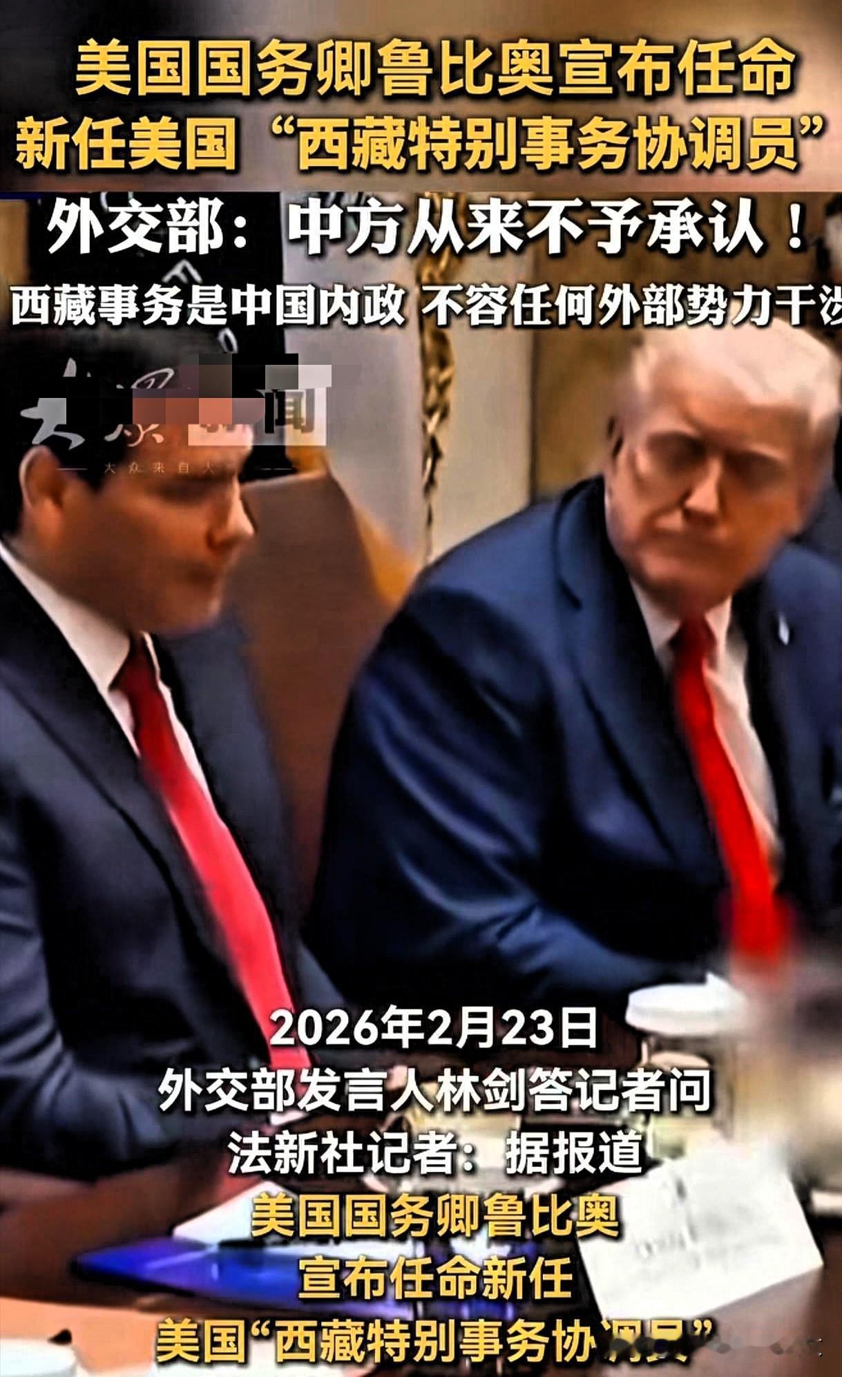 “西藏特别事务协调员”,这又是特朗普对中国凭空捏造的一张牌。 2月23日,美国国务卿鲁比奥宣布将任命新的美国“西藏特别事务协调员”。 在美国总统特朗普高调宣布即将访问中国之际,美国国务卿鲁比奥宣布任命“西藏特别事务协调员”,这无疑是为特朗普访问中国、增加与中国谈判筹码而凭空捏造的一张牌。很显然,这张牌对美国来说,几乎没有什么政治、经济成本,但对中国来说,确实是干涉中国内政、攻击和抹黑中国人权政策的损招,以此来换取谈判桌上的筹码。 这是美国在与中国打科技战、贸易战、关税战并未取得预期效果之后,由实向虚,转而开始打一些虚头巴脑具有噱头式的牌,比如大打民主牌、大打台湾牌、特朗普发文力挺高市早苗,到现在又打出“西藏特别事务协调员”的牌。 这种噱头式的牌,成本小,操作灵便,政治影响小。但对于中国来说,除了恶心人外,分量根本就不足,没有什么大不了的。这从侧面也反映出,美国对中国已经没有什么牌可打了,可谓黔驴技穷! 鲁比奥:将任命美国新任“西藏特别事务协调员”