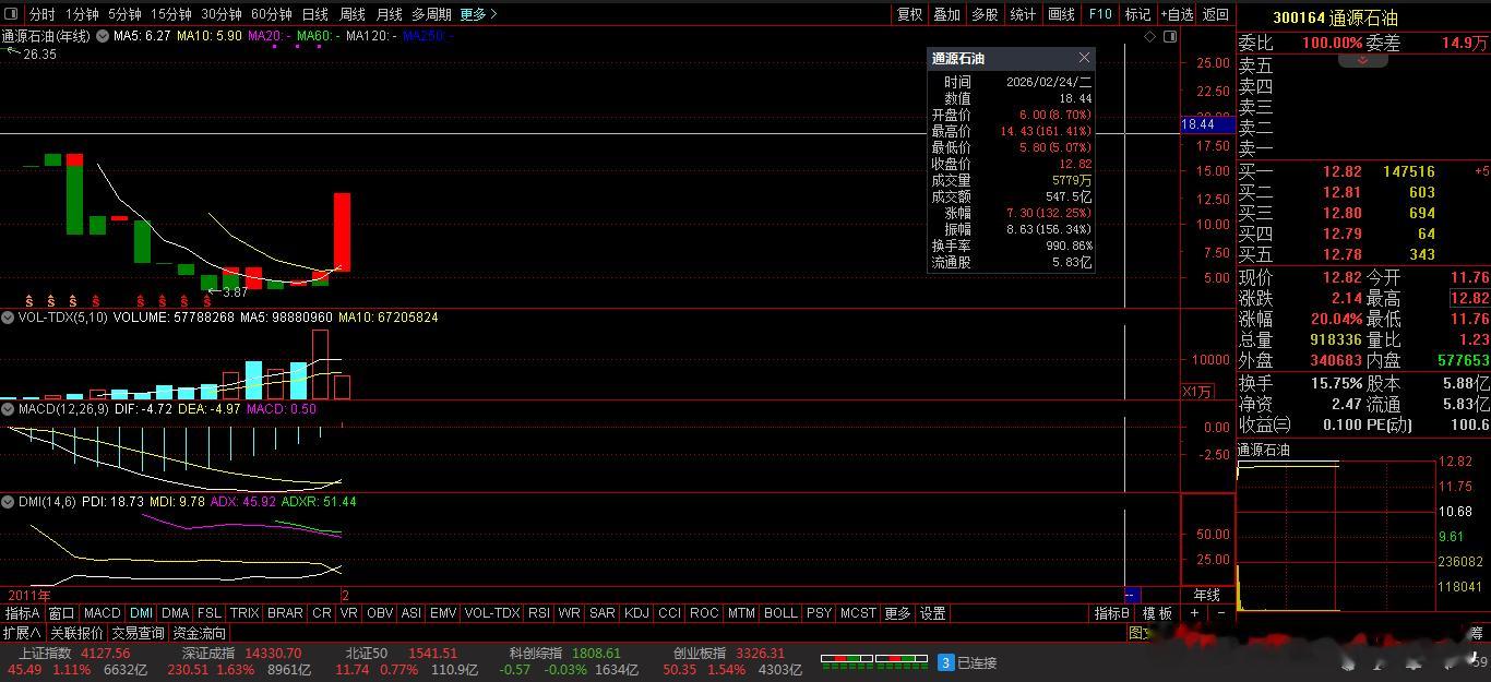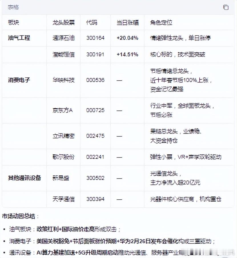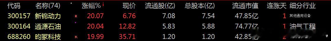 盘面透视:今日市场:活跃板块:主要集中在:新锦动力、通源石油、昀冢科技等个股涨停。主要带动:油气工程、消费电子、其他通讯设备等细分领域全面走强,相关板块和龙头股表现突出。下面梳理核心驱动因素: