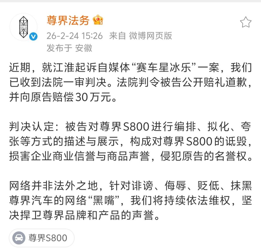 新年开工第一天,“赛车星冰乐”就领到法院判决书了,赔偿尊界汽车30万,外加公开赔礼道歉。这下看他还敢不敢编排人家! 只是有点遗憾,这判得有点低啊,太便宜他了。不过,尊界法务也算是支棱起来了。年前,“赛车星冰乐”还公开诉苦说自己的“年框”被欠费,现在开年又要赔偿尊界30万,雪上加霜啊!这只能说他是咎由自取,当你用失控的情绪编排别人的时候,为什么不想一下后果呢?30万拿来做善事帮助有需要的人多有意义,非得拿来在网上当黑嘴,这下长教训了吧!下次再编排,就不是30万这么简单了。尊界