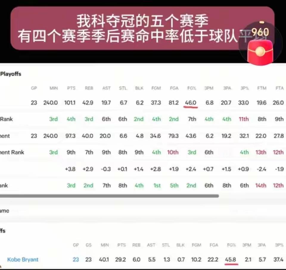 科比五次夺冠年季后赛命中率4次低于球队平均:2010年季后赛,湖人所有球员平均命中率46%!科比命中率45.8%!