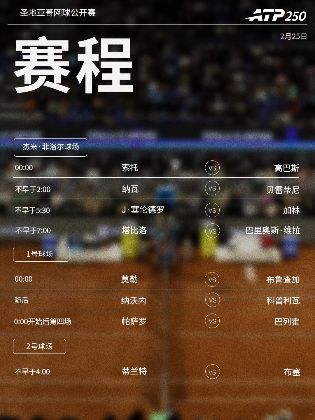 ⭕️ ATP250圣地亚哥网球公开赛📍智利·圣地亚哥🎾 贝雷蒂尼、J·塞伦德罗、塔比洛出战。