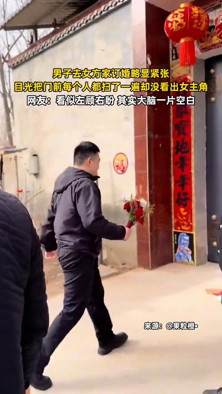 男子去女方家订婚略显紧张,目光把门前每个人都扫了一遍却没看出女主角。 网友:看似左顾右盼,其实大脑一片空白。 2月23日(发布)河南。来源:果粒橙。