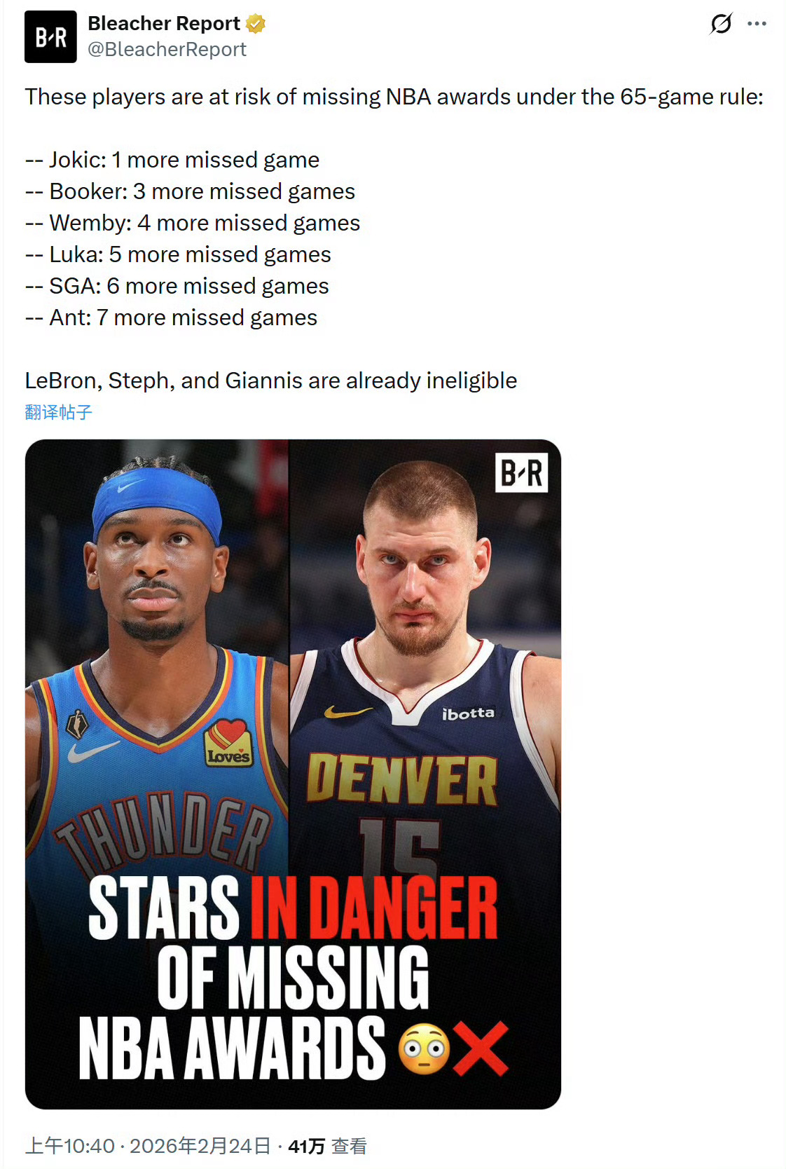 约基奇再缺阵1场,布克再缺阵3场,文班亚马再缺阵4场,东契奇再缺阵5场,亚历山大再缺阵6场,爱德华兹再缺阵7场。