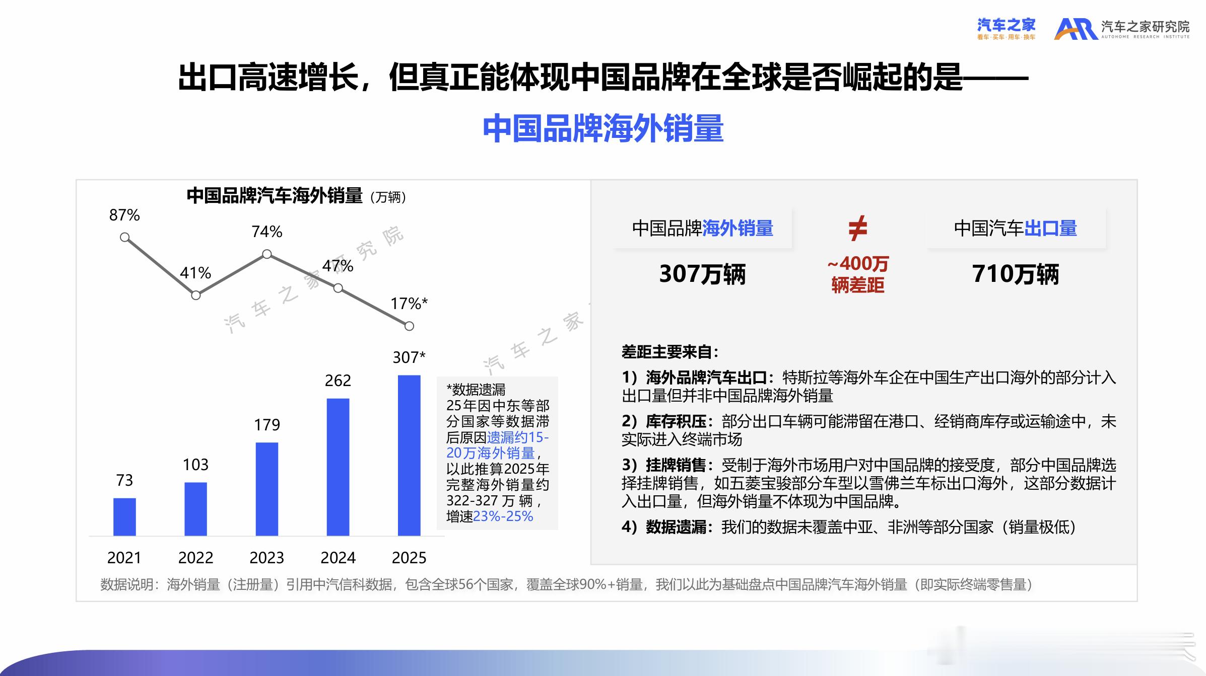 但同时也要看到,“中国汽车出海” 与 “中国品牌出海” 之间仍存在差距(图6),中国品牌真正走向全球、参与海外竞争,还有很大的增长空间。