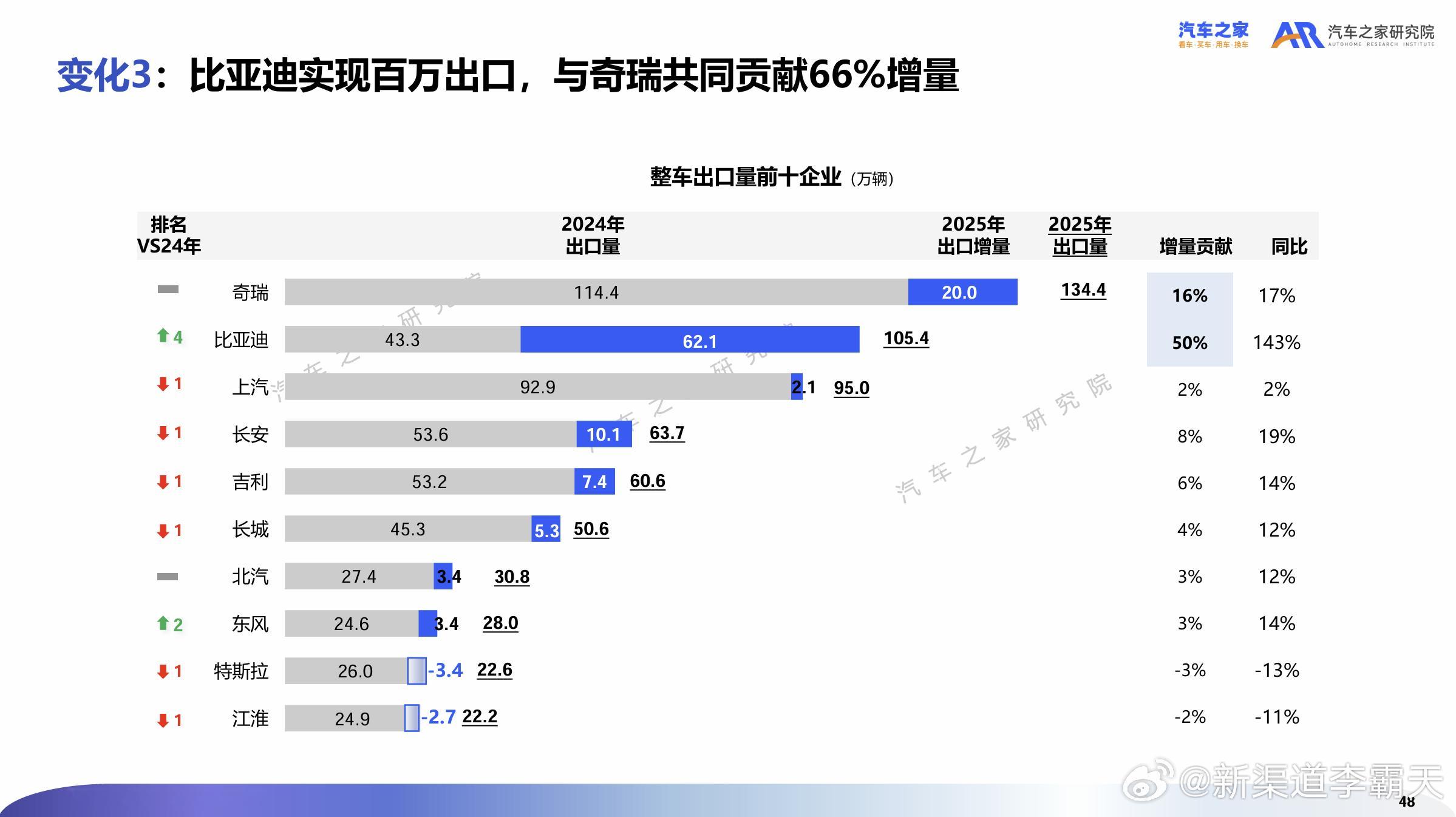 中国汽车出口已连续多年保持高增长,2025 年出口总量突破 700 万辆(图4)。其中比亚迪表现亮眼,奇瑞则延续 “出海一哥”的表现(图5)。