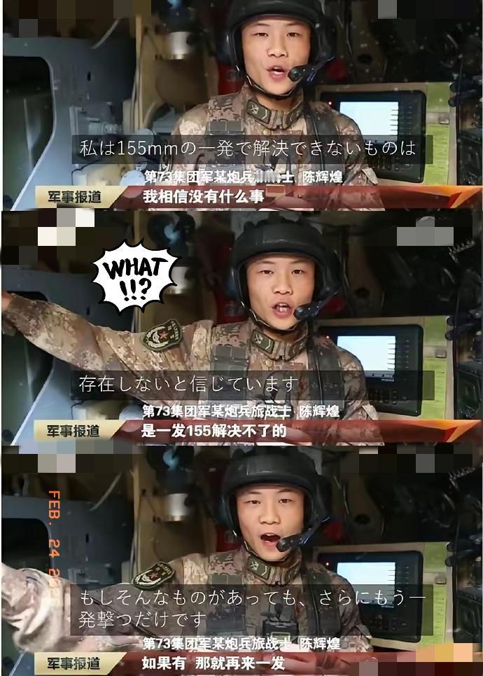 解放军战士在日本推圈爆火,原因竟然是因为一句话! 这位战士面对镜头,没念稿子,也没喊口号,就是用一种特别平常的语气说了一句:“我相信没有什么事情是一发155毫米炮弹解决不了的,如果有,那就再来一发。” 就这么一句话,配上咱们国产155毫米自行火炮怒吼的画面,传到日本后,直接把他们的推圈给整破防了,而且还圈粉无数。 没有华丽辞藻,没有刻意煽情,战士这句直白又硬核的大实话,比任何宣传都有力量。155毫米火炮的震撼威力,配上这份从容自信,瞬间让海外网友感受到真正的大国底气。 过去我们总习惯低调内敛,可如今直白亮明态度,反而更能消除误解、震慑人心。尊严在剑锋之上,真理在大炮射程之内,这就是最硬核的国际语言。 这种真实又霸气的表达,你觉得是不是最有说服力的?