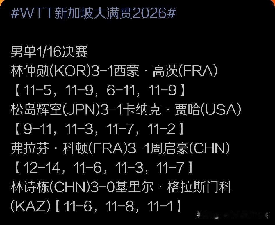 WTT新加坡大满贯赛的赛场上,结束了首轮的争夺之后,尽管少数顶级球员出现了爆冷出局的情况,但大部分种子球员,还有国乒主力还是能在各自对手面前锁定比赛胜利成功跻身男单32强。不过进入32强的争夺之后,确实各路高手的竞争力持续上升,而且对手们的综合实力也是同步提高,对于国乒球员来说,当然再想晋级就会变得难度有点大。而外协会高手之间的正面交锋也同样出现了彼此实力接近,谁能胜出都难度不小的情况。所以比赛也可谓越来越激烈,同时也越来越具有不确定性。 其中来自韩国的名将林钟勋作为一个善于打双打包括混双的球员,在单打赛场上,这次也贡献了不俗表现,面对来自法国的名将西蒙高茨,林钟勋这次是展现出了很好的竞技状态,除了第三局6:11输掉一局之外,在第一局、第二局和第四局都是掌控着比赛节奏。而且他的出手凶猛,也因为打的比较坚定所以命中率相对比较高,分别以11:5和11:9以及11:9的比分赢下第一局,第二局和第四局锁定一场3:1的胜利,也拼下一个男单16强的席位。 而另一场男单交锋当中来自美国的名将贾哈这次面对日本近期上升势头迅猛的松岛辉空没能占到任何便宜,尽管在第一局依靠关键分能力11:9先下一城。但后面松岛辉空还是在适应了贾哈的出手节奏之后打出了自己凶猛的进攻方面的优势。也把比赛节奏控制在自己手中,以11:3、11:7和11:2的悬殊比分连下三城,从而后来居上,以3:1的比分淘汰贾哈,锁定一个男单的16强席位。 而更为令人关注的一场比赛。也就是来自法国的小将科顿与国乒名将周启豪之间的交锋,可以说比赛进程及结果与我们的预料有颇多相似之处。科顿作为一个天资聪明、上升势头迅猛、打硬仗能力较强的球员,在周启豪面前还是展现出了自己的战斗力。尽管第一局的比赛他12:14先输一局,让周启豪先下一城,但后面科顿还是通过第一局对于周启豪的摸底,在后面越来越掌控比赛主动权,而且直接把比赛带进自己的节奏,他的快速出手,还有衔接让周启豪打起来比较吃力6:11、3:11、7:11,连输三局,而科顿也就此实现了3:1的逆转胜出。确保自己冲下一个男单的16强的席位。 值得一提的是,在后面,林诗栋和来自哈萨克斯坦的名将格拉斯门科的比拼当中,林诗栋还是彰显了自己应对这种实力不算顶级的球员时的那种综合实力优势。他也是以3:0的比分又轻取对手,锁定一个男单的16强席位。双方三局的具体比分是11:6、11:8和11:1。让我们再次恭喜晋级的球员!