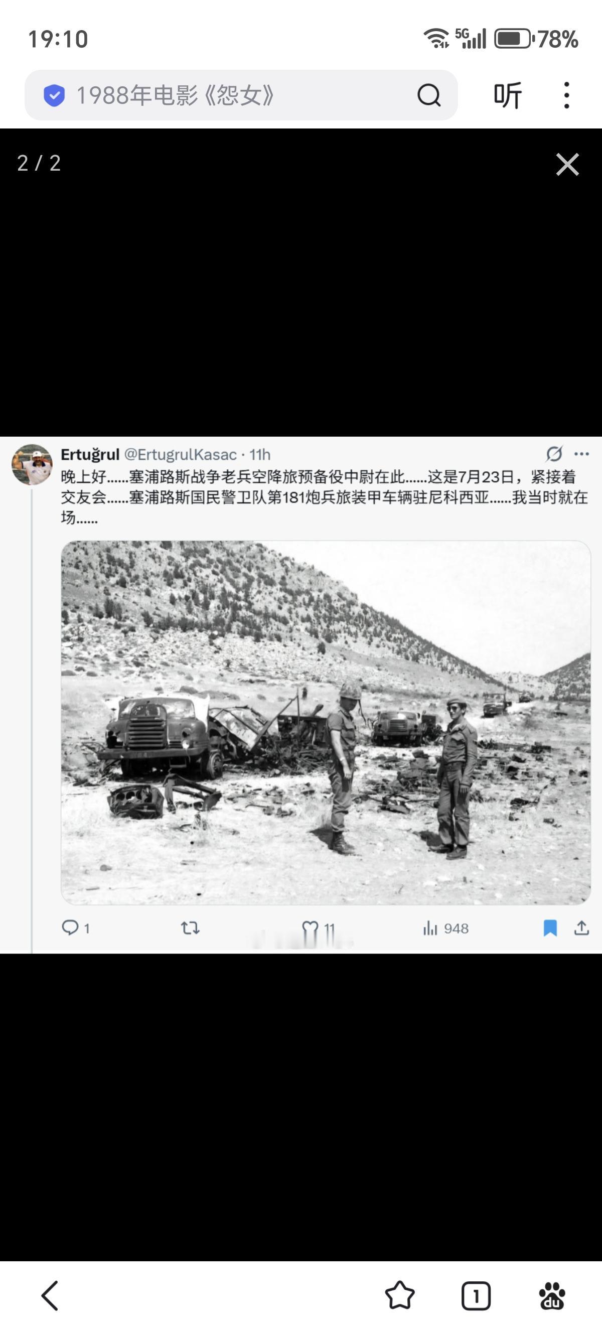 因为塞浦路斯国民警卫队马蒙-赫灵顿装甲车车长的回忆录,炸出了一群土耳其人,发了些彰显当时土耳其武功的照片。这个就宣称是驻尼科西亚的塞浦路斯国民警卫队181炮兵旅遭到土耳其军队袭击后的照片,但应该是181野战炮兵营(181MPP),能看到车队里的25磅炮。 当时塞浦路斯国民警卫队有6个野战炮兵营,一共装备了54门25磅炮、20门BS-3 100毫米炮、4门3.7英寸高射炮(用作野战炮,可以确定被用于过炮击岛上土耳其裔控制区)、8门M116(二战时的M1A1) 75毫米山炮