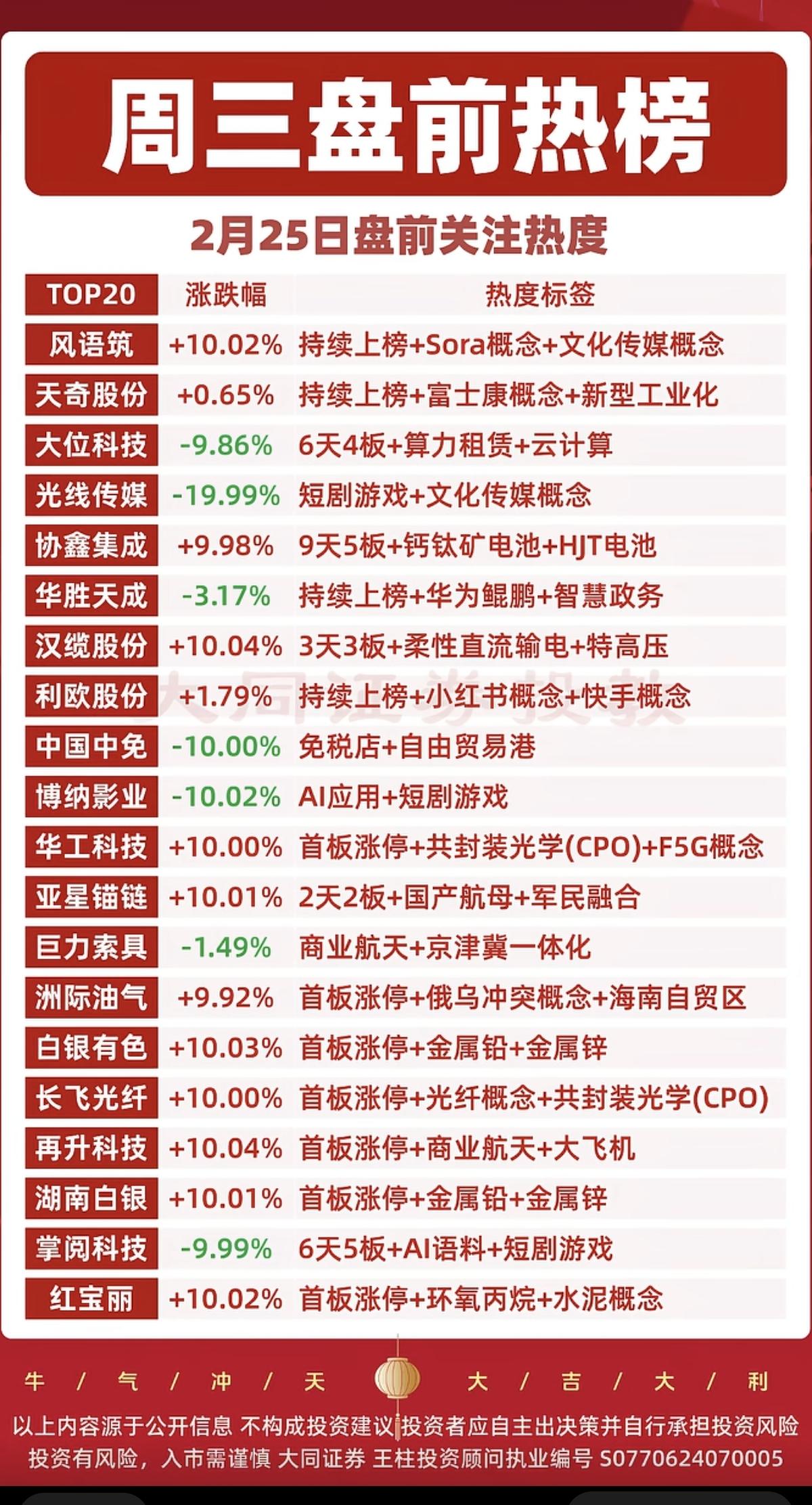 2.25周三 成交活跃个股+人气热搜榜! 1.短剧互动+文化传媒 2.小红书+快手概念 3.CPO共封装光学 4.有色金属铜锌 5.化工原料