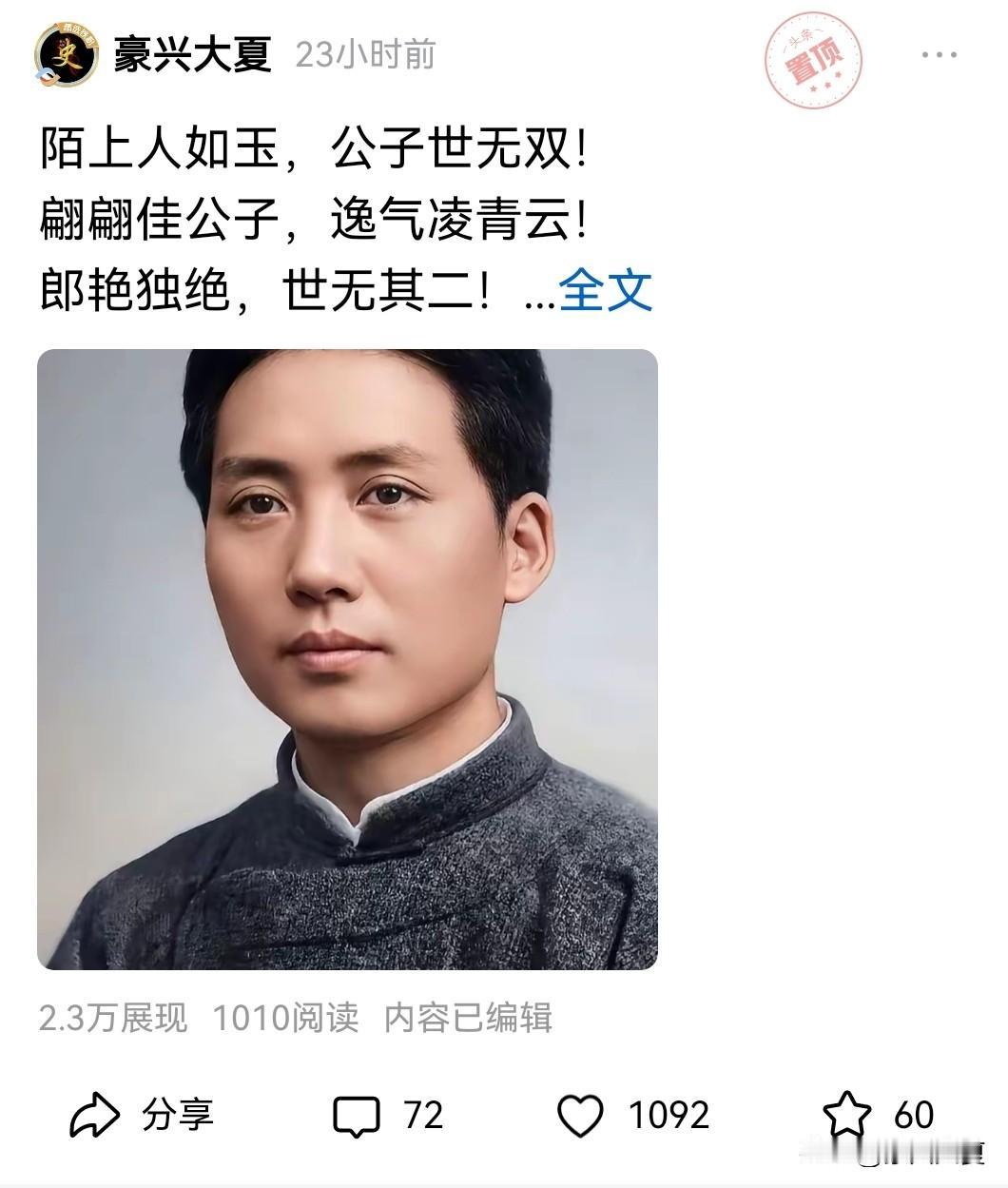 昨天发布的微头条1010的阅读量,1092个点赞的!这让我感到很是惊讶。这可能就是中国人民信仰的最好展现!这就是人民太阳的光辉!永远照亮着祖国大地和人民!激励着我们前进的步伐! 作为后辈的我们,能做的就是弘扬先辈们的意志和精神,热爱我们的祖国。人民永远怀念您!毛主席万岁!毛主席万岁!毛主席万岁!