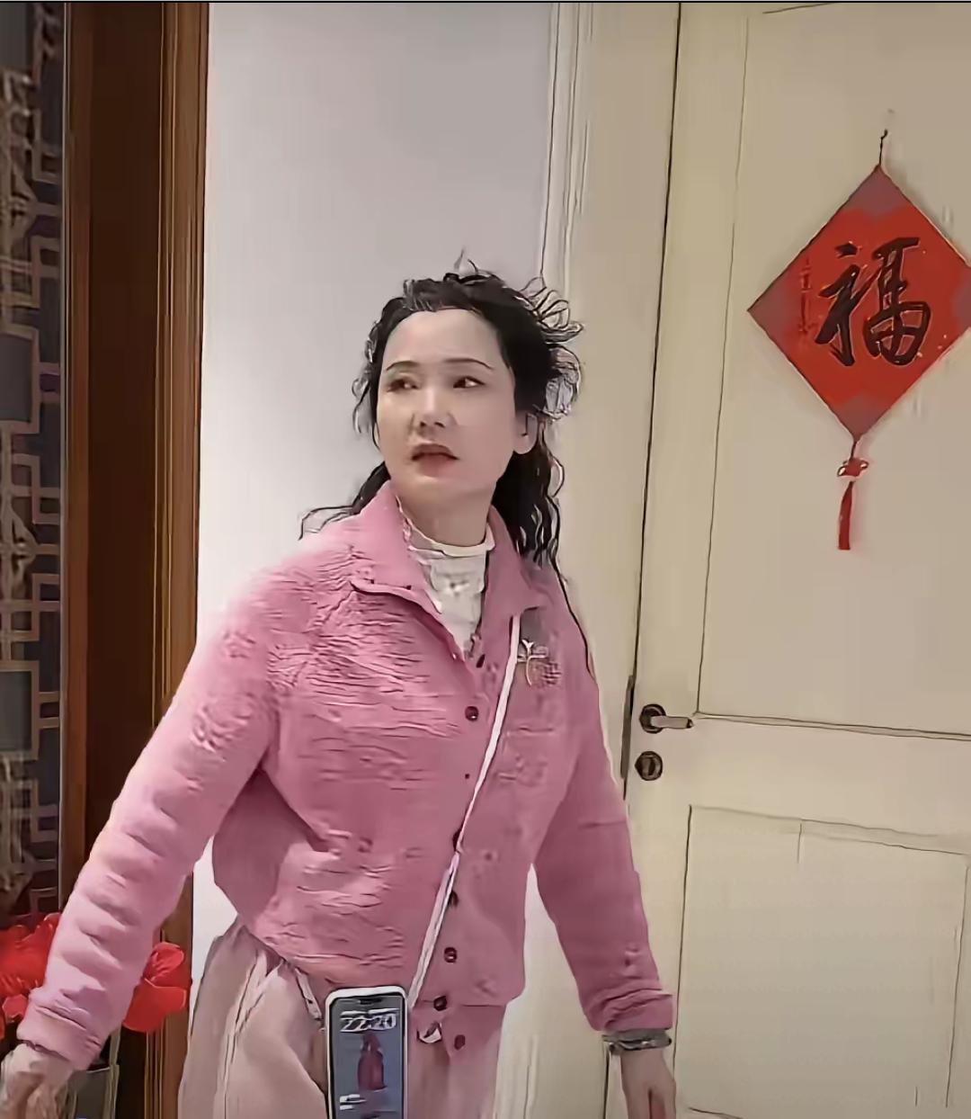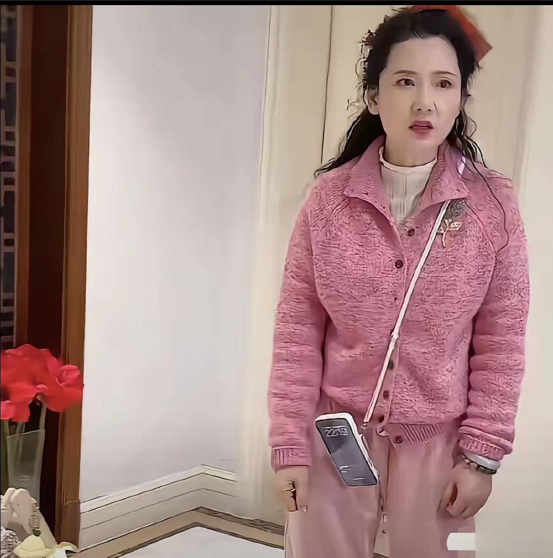 何赛飞穿粉红套装,头扎红色蝴蝶结,皮肤皙白,紧致,比实际年龄至少年轻20岁,好漂