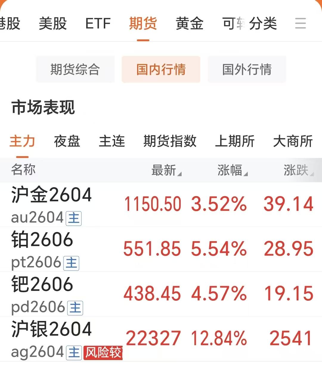 黄金和白银是否还有上涨空间呢? 2月24日, 国内贵金属四大品种皆上涨。 通过下图,可以明显看出: 沪金2604合约收盘于1150.5元, 上涨3.52%,继上涨39.14元; 铂金2606合约收盘于551.85元, 上涨28.95元,涨幅5.54%; 钯2606合约收盘于438.45元, 上涨19.15元,涨幅4.57%; 沪银2604合约收盘于22327元, 上涨2541元。涨幅12.84%。 贵金属处于上涨中!