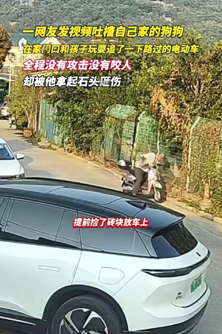 2月22日,福建泉州。网友发视频吐槽:我家的小狗只是在家门口和孩子玩耍,就追了一下路过的电动车男子,全程没有攻击、没有咬人,却被他拿起石头狠狠砸伤…… 视频显示:男子经过这家门口之前,停车在路边捡起一块石头,砸小狗的正是这块提前准备好的石头。 评论区绝大部分网友认为该男子应该不是第一次被这只小狗撵,要不然不会提前准备好石头。大家都觉得这条小狗该砸,男子的行为大快人心。 更有网友把这家主人小狗不拴绳的行为和他不文明停车的行为联系在一起,认为就是一个自私自利的人。这么一条小路上,人家都是横着停车,就他们家是斜着停的。 本来想曝光别人的,没想到最后这火烧自己身上了。这种人啊,该怎么形容这样的人呢?