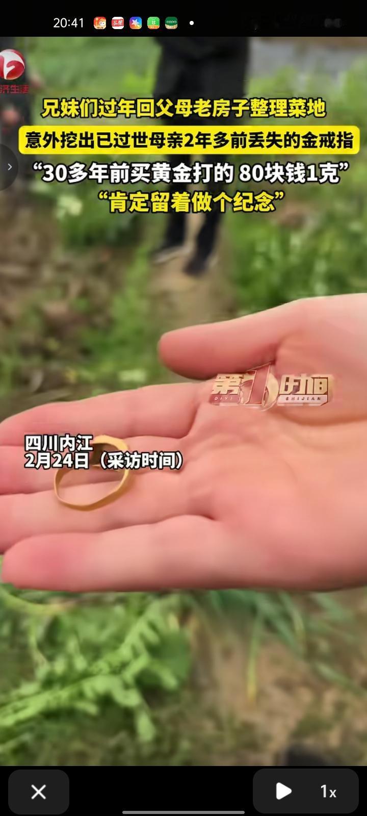 2月23日,内江市资中县。兄妹们过年回父母老房子整理菜地,意外挖出已故母亲两年多前丢失的金戒指,感觉像中彩票一样开心。 当事人刘女士称,这枚戒指是三十多年前给父母买黄金打的,80块钱一克,具体多少克不知道。两年前母亲生病了,母亲把戒指还给她,她说道:“你别想那么多,开心一点,这个病会好的,你一定要戴在手上”。 结果,她把戒指戴在母亲手上,第二天早上戒指丢了,在家里找了无数次了,这次找到真是太开心了,肯定会留着做纪念。