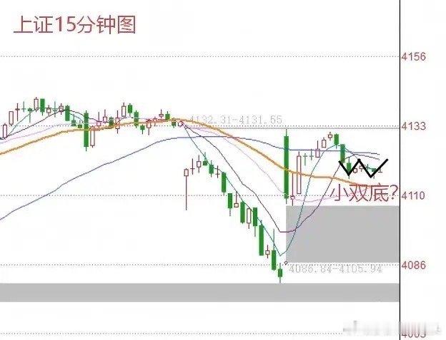 第二,从今天全天的走势来看, A股市场的主力向上做多的意图还是比较清晰的。因为今天A股早盘是在隔夜外围市场全线大跌的情况下,走出了独立高开的走势。而且今天午后虽然有所震荡走低,但是从午后的分时走势图来看,午后分时图主力兜底迹象特别的清晰。从上证指数的15分钟k线图来看,15分钟级别可以看到15分钟级别小双底的结构。大家请看图一上证指数15分钟k线图。也就是说,从上证指数15分钟图的走势来看,至少明天上午的交易时间段相对是比较偏多头的。