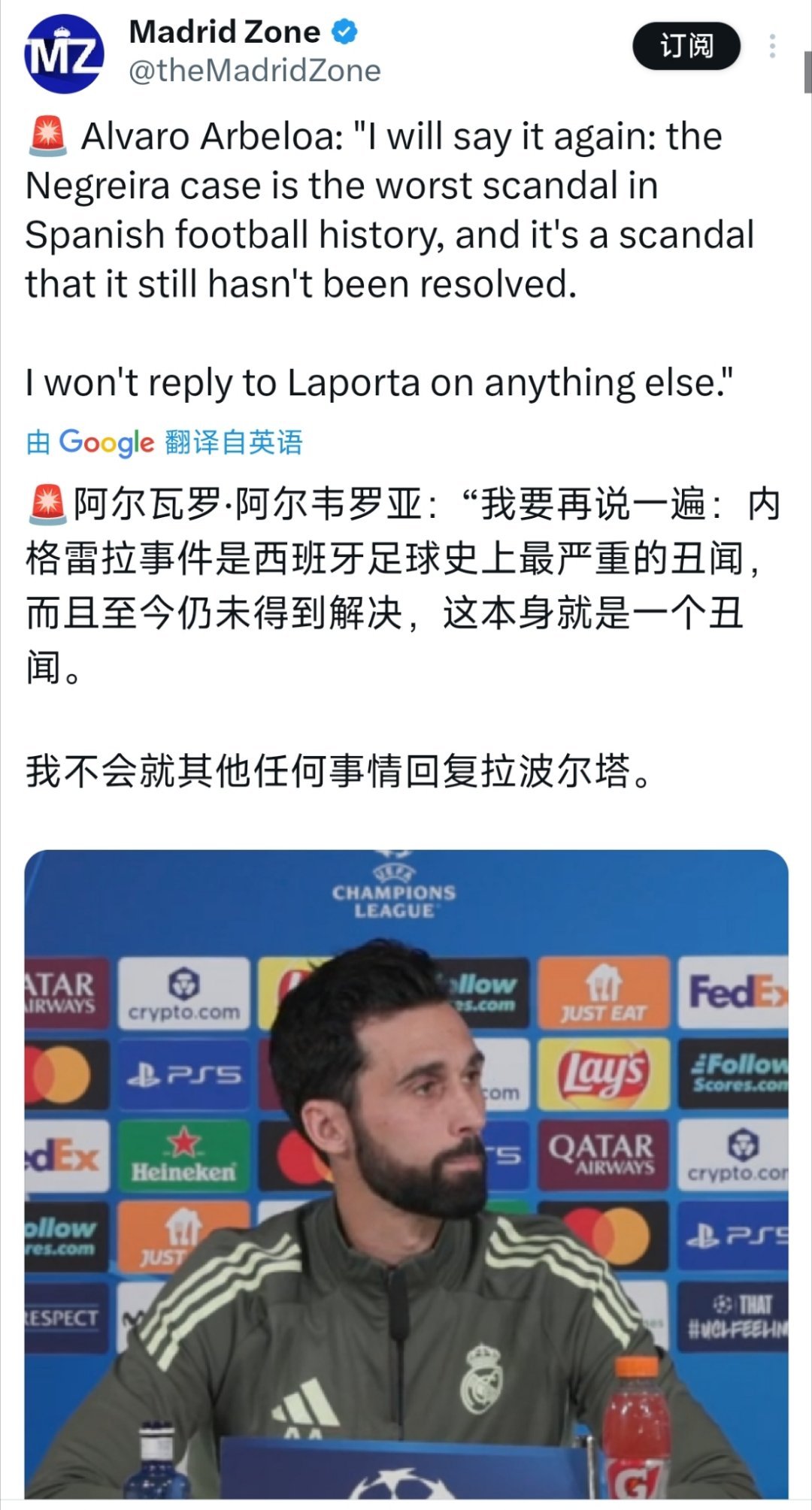 人不要脸方可天下无敌,高贵的贵族,双重标准的俱乐部。有时候真的忍不了,纵使有很多人认为我为了流量发一些东西,我都已经懒得解释,赫伊森的事从始至终许多人在跟进,而我就发过一次,今天伟大的阿韦罗亚先生所说的话再次让我不得不说点什么。要脸吗?又提内格雷拉案,有确凿证据吗?纯靠猜疑怀疑,三四年的事,得出过什么结论,反而成了每次皇马战绩不好,拿来黑巴萨引导舆论的工具。反种族歧视大旗,就允许球员在对方客场做挑衅动作?反而让对方忍受着,忍不了了,你又成了受害者。如此高贵的球队,如此高贵的球迷,高贵的球员,所有一切优待都应该是你们的,自己犯错轻描淡写,凭借一身白掩盖那一身污浊。巴萨并不完美,但总来都在与邪恶在斗争。然而邪恶始终想要成为特权主义的优待者,别人无意踩了你一脚说声“对不起”,你却依依不饶,拿着大喇叭哭着向全天下说你的委屈。而你故意踩人一脚,你却认为事后一句对不起就完了,矫情什么。从未见过如此双标,如此令人作呕的俱乐部,更别提那些裁判事件,背后搞鬼的那些事。👎👎👎👎👎 道德制高点绑架别人的不少,有时候和一些东西没法讲道德。巴萨 至死不渝红蓝魂
