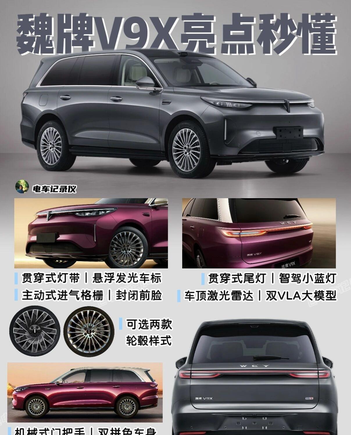魏牌V9X亮相工信部‼️最全配置解析来啦🤩魏牌V9X亮相工信部新车申报目录啦‼️这是魏牌乃至长城集团最新的旗舰车型,新车也诠释了长城对旗舰SUV的理解。 我根据官方信息和工信部申报材料,整理了一份目前最全的配置解析,一起来看看吧🤩 1️⃣新车的长宽高为5299*2025*1825mm,轴距为3150mm,是妥妥的大型6座SUV。这么大的车身尺寸,简直就是家用利器,每排乘客都可以坐得很舒服。 2️⃣电池方面 新车配备由蜂巢能源制造的三元锂电池,这属于长城自产自销了。有53.6/77.7度两种电池包,纯电续航分别为240km和363km。配合上800V平台和6C超充,日常当成纯电车开完全没问题。 3️⃣动力方面 新车搭载2.0T发动机,最大功率175kW,配备4挡DHT。虽然目前还不知道电机功率,但知道新车零百加速是4秒级的,对于这个尺寸的SUV而言,动力性能十分恐怖了。 4️⃣智驾方面 新车配备激光雷达,会搭载长城最新的智驾和座舱双VLA大模型技术,官方称为原声AI智能体。此前我体验过新款蓝山的智驾VLA,城市领航体验相当丝滑,长城的进步速度真的相当快。 5️⃣底盘方面 V9X是长城归元S平台的首款车型,将配备双腔空气悬架和后轮转向,配合上AI底盘,即便是大尺寸SUV也能拥有相当出色的灵活性和驾乘舒适性。 6️⃣售价方面 个人猜测其售价区间在35-45万左右,将对9系旗舰SUV市场发起冲击! 40万级旗舰SUV车型,你会选哪台呢?
