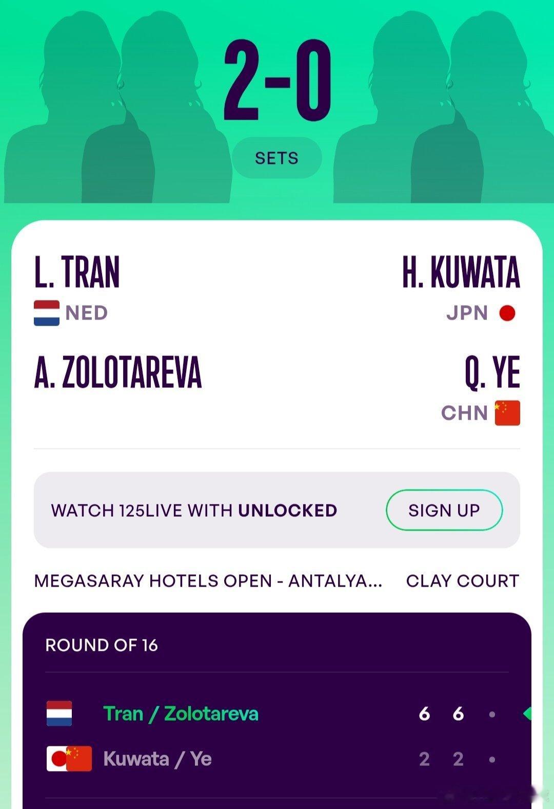 叶秋语🇨🇳/桑田宽子🇯🇵2-6/2-6不敌特兰🇳🇱/佐洛塔廖娃🇷🇺,止步首轮。