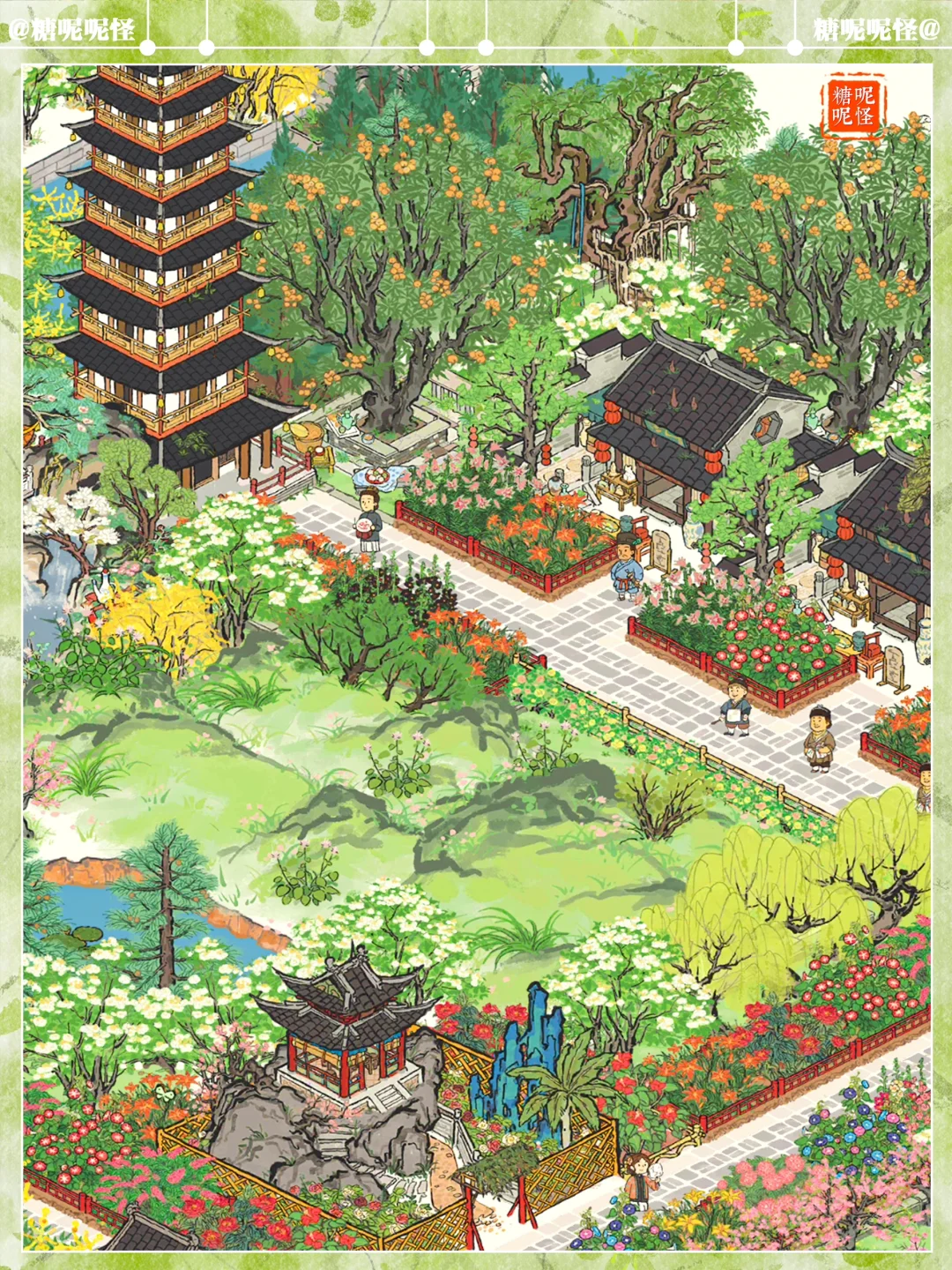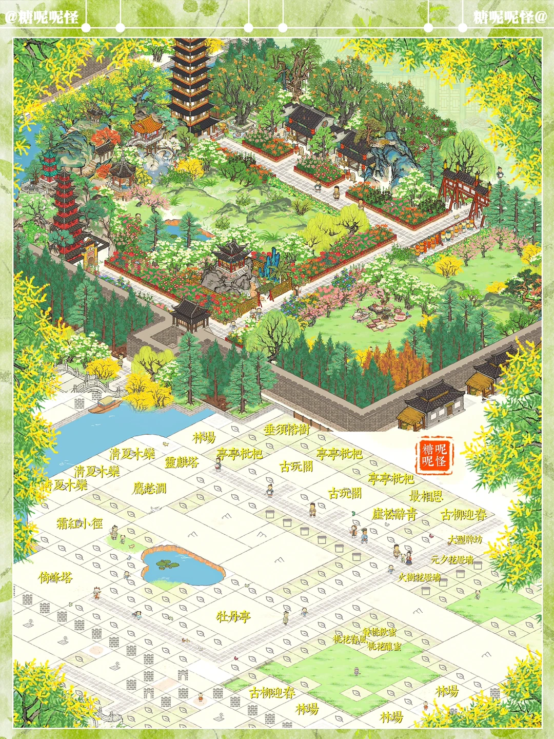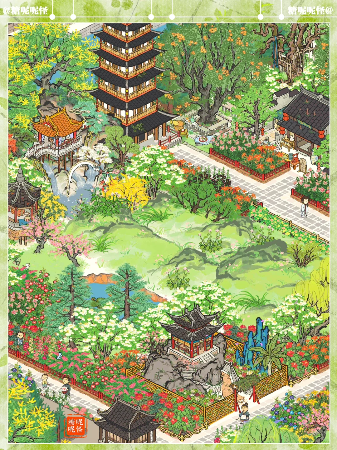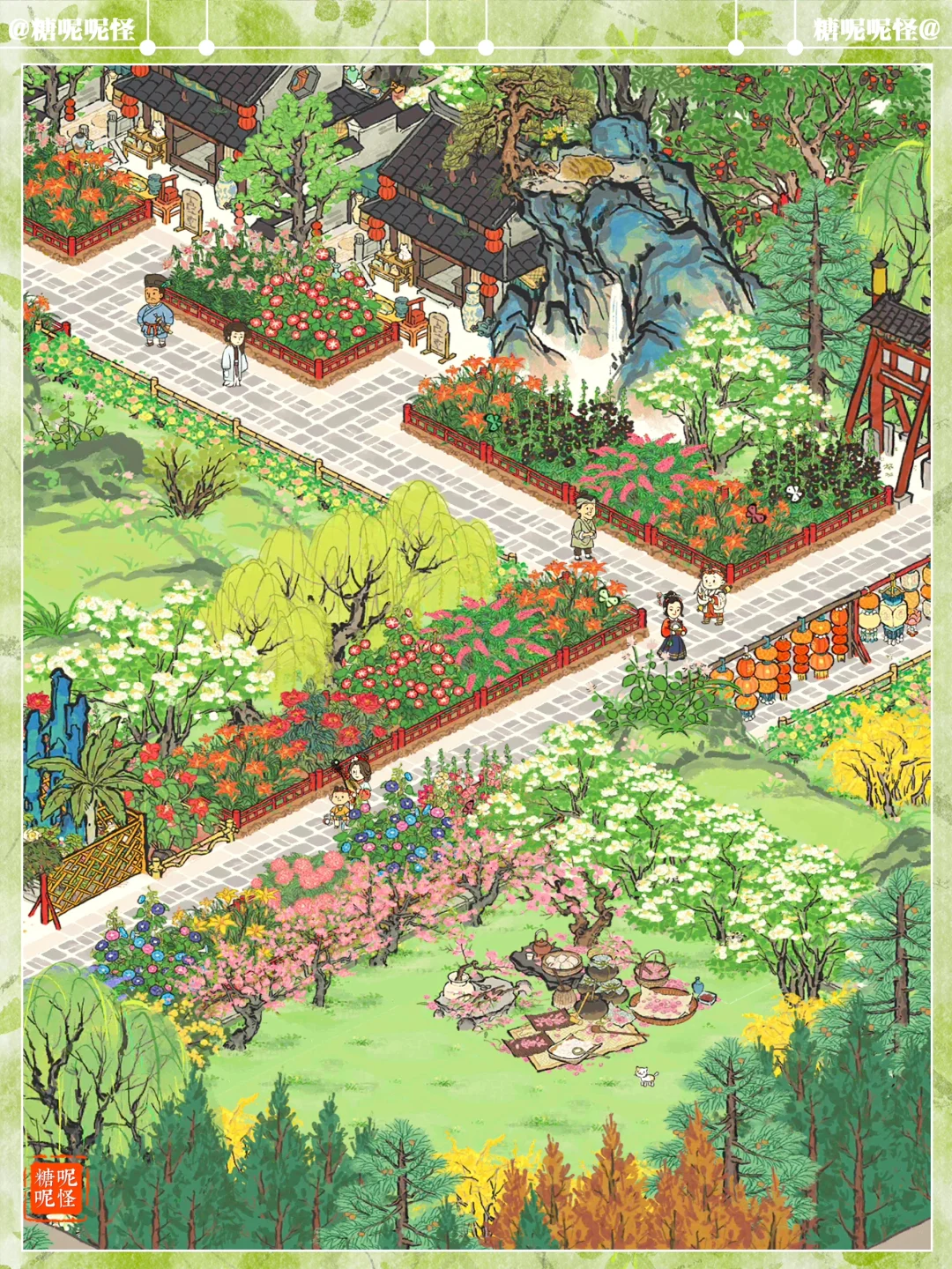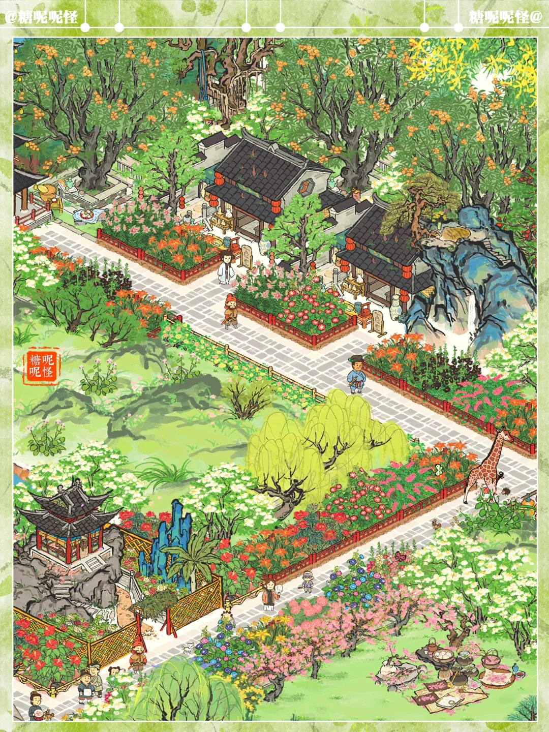 🌼扬州府疏影边+华枝边+暗香边+汶河边,草地繁花小布局 🌼疏林草地上盛开着鲜花 🌼建筑:鹰愁涧|霜红小径|倚峰塔|灵麒塔|亭亭枇杷|古柳迎春|垂须榕树|崖松辞青|清夏木栾|牡丹亭