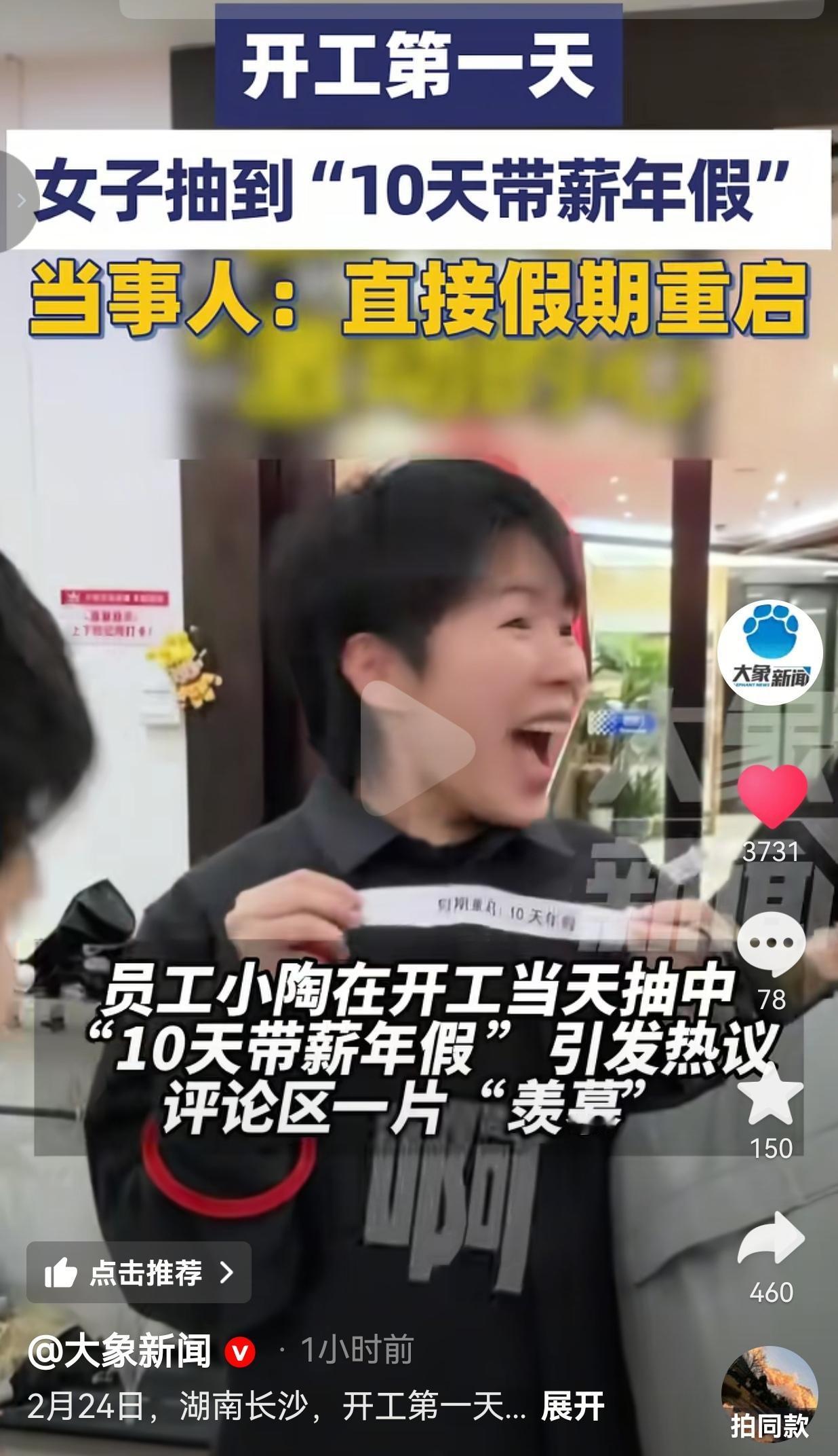 运气太好了!隔着屏幕都能感受到他的快乐!大年初八,湖南长沙的小陶揣着一肚子“节后综合症”,比平时早到了公司。 她本来只是想避开早高峰,顺便把工位收拾一下,没想到这一早到,直接把自己的2026年开成了爽文剧本。 为什么会这样呢?因为,这家的00后老板直接搞了个开工抽奖,奖品从平板电脑、金钞到现金红包应有尽有。 小陶随手一抽,纸条上的字让她瞬间大脑空白:“假期重启:10天带薪年假”。 她看到纸条后,先是一愣,而后笑到合不拢嘴,对着镜头挥挥手:“拜拜,我又回家过年啦!” 小陶说,过年的时候因为工作忙,在家只待了短短几天,总觉得没陪爸妈待够。这次抽中10天假,她第一反应就是:“终于能补上这个遗憾了。” 这个福利不是画饼,老板已经把10天带薪年假直接充进了她的OA系统,什么时候休、怎么休,全由她自己说了算。 网友看到后评论说:“这哪是开工,这是开了个挂啊!” 也有的网友说:“00后老板果然懂打工人,知道我们最缺的不是钱,是能心安理得躺平的时间。” 还有的网友说:“我酸了,我老板开工只给了我一句‘好好干,今年争取不裁员’。” 说实话,大家羡慕的不只是那10天假,更是这份“被看见”的温柔。 通过这事,也给所有管理者上了一课:比起画大饼、喊口号,真正能凝聚人心的,是尊重和共情。 他知道打工人最需要的不是金钞,而是能喘口气的时间。他明白员工不是机器,是有家人、有情感的普通人。他用一个“反常识”的福利,让整个公司的开工日,变成了一场双向奔赴的温暖。 这让我想起一句话:“最好的企业文化,是让员工觉得自己被当人看,而不是被当工具用。” 针对此事,你有什么看法呢?欢迎评论区唠唠。