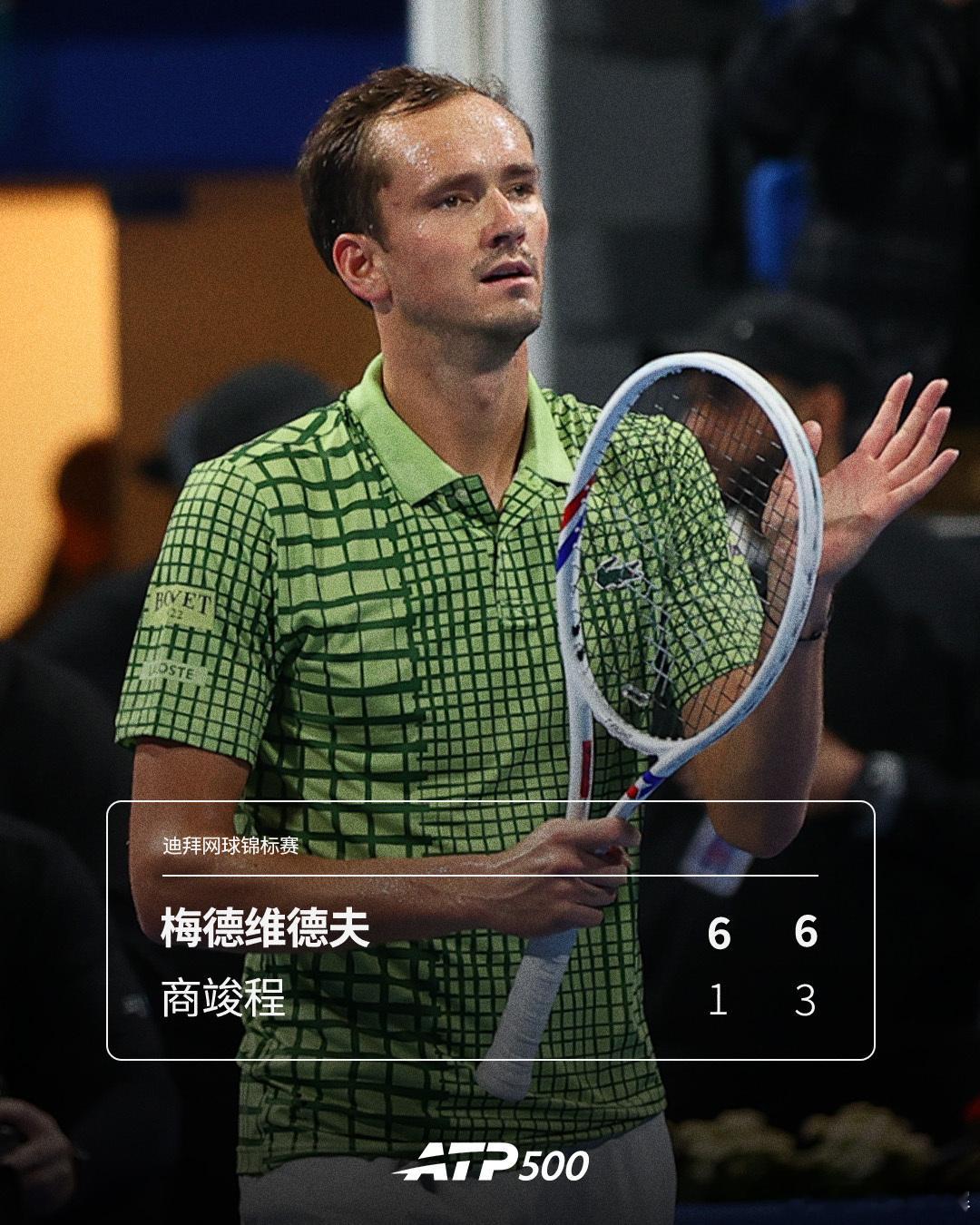 ATP500迪拜网球锦标赛男单首轮,商竣程1-6 3-6不敌3号种子梅德维德夫,连续两周输给对手,后者下一轮将迎战瓦林卡。