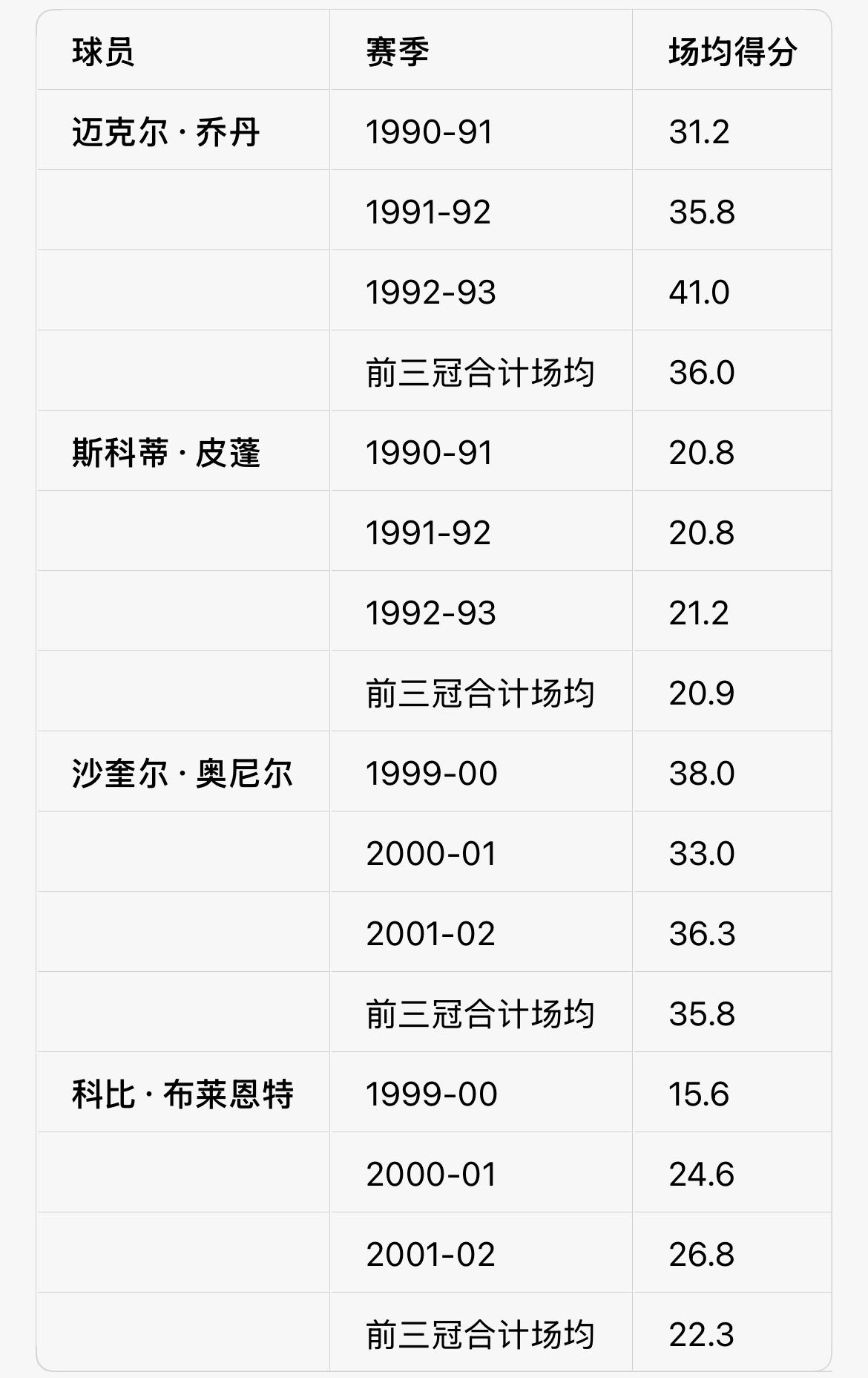 同样获得三连冠,奥尼尔是单核?还是乔丹是单核?科比在奥尼尔的培养下,跟随湖人获得三连冠。皮蓬在乔丹身边也获得了三连冠!作为球队的二当家,科比五冠是他的名片!皮蓬则有6冠!不同的是,总有人说科比三连冠是核心,而乔丹则是单核!通过对比数据,如果奥尼尔不算单核,那么乔丹单核更是无从说起!如果乔丹是单核,那么奥尼尔更像是单核!乔丹 科比 奥尼尔