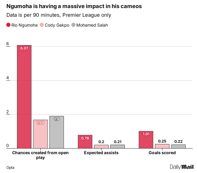 他在成功传球等其他数据上也领先,当然还有进球和射门转化率(这一数据被他89分钟1次射门1粒进球严重拉高)。这些数据印证了肉眼可见的事实:恩古莫哈正是利物浦迫切需要的进攻创造力火花。