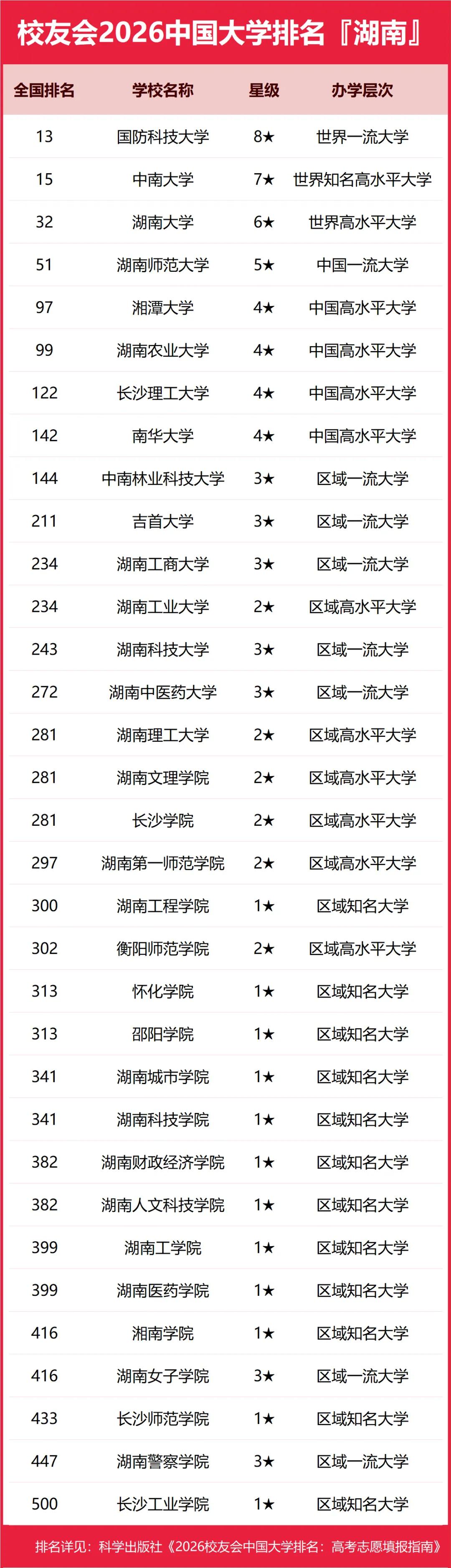 校友会2026中国大学排名,湖南的高校表现还是可以的。国防科大排名全国第13,为世界一流大学;中南大学第15、湖南大学第32,稳居世界高水平行列。 省内高校中,前100里还有湖南师大、湘潭大学和湖南农业大学。其他靠前的还有长沙理工,南华大学和湖南科技大学等。这里要说一下低调有内涵的南华大学。 南华大学确实是一所典型的“低调有内涵”的大学。你看它英文名University of South China,又有多霸气。它虽然不在省会而位于交通重镇衡阳,也没有“双一流”头衔,但在核科学与医学这两个核心领域,拥有着远超普通一本院校的硬核实力。 在最新的大学排名中,南华大学稳居全国高校中上游,属于“区域特色研究型大学”。学科实力这块,核医双雄,属于行业“隐形冠军”。 南华大学的内涵主要体现在其“核特色”与“医品牌”的深度融合上,拥有多个博士点和国家级平台。 1. 核科学与技术:全国前10%,行业“黄埔军校” * 学科评级:在教育部第四轮学科评估中获评B,排名全国第7位。这个成绩甚至超过了部分985高校,是湖南省属高校中该学科的最高评级。 * 硬核实力:拥有一级学科博士点和博士后流动站,入选湖南省“世界一流培育学科”。学校由工信部、国防科工局、中核集团共建,被誉为核工业的“黄埔军校”,毕业生进入中核、中广核等央企的比例极高。 2. 医学:ESI全球前1%,湖南医学“第二极”仅次于中南大学湘雅医学院 * 国际认可:临床医学、药理学与毒理学等8个学科进入ESI全球排名前1%,科研影响力达到国际水平。 * 省内地位:拥有临床医学一级学科博士点。在湖南省内,除了中南大学湘雅医学院,南华大学的医学实力和认可度稳居第二梯队,其附属医院在衡阳响当当,近几年在长沙也有布局,好几个附属三甲医院开到了省会长沙,就业质量非常扎实。 为什么说它“低调有内涵”? * 低调:地处衡阳而非长沙,且非“双一流”高校,导致其在全国范围内的知名度不如同层次的省会高校。 * 有内涵:拥有8个一级学科博士点、5个博士后流动站,以及核科学与技术这一全国顶尖的特色学科。这种“核医结合”的独特优势,让它在特定行业(如核工业、医疗系统)拥有极高的声誉和就业竞争力,是典型的“行业强校”。 在北京,高考录取时该校投放的都是优质专业的名额,而且不用担心调剂,目前分数也不太高,交通又方便(多趟高铁直达+南岳机场航班直飞),当地美食多且非常好吃尤其小炒享誉全国,推荐报考。