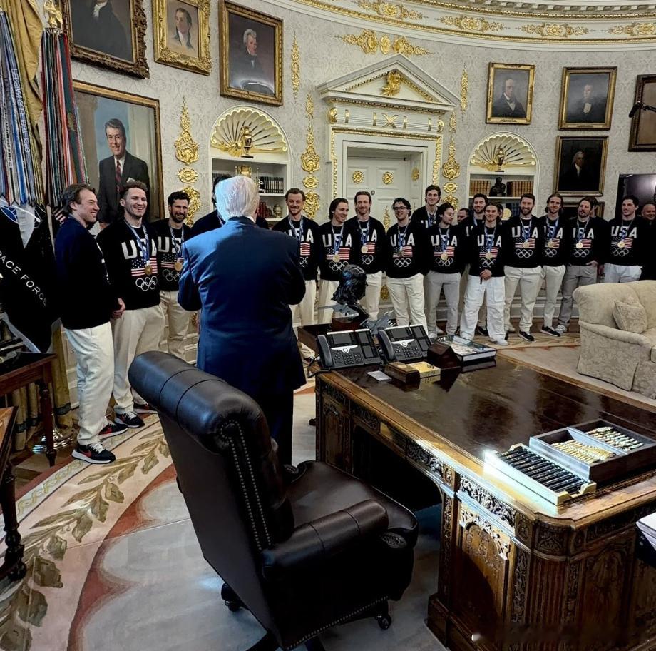 【黄金时代】川普总统在椭圆形办公室接见了美国男子冰球冠军队,队员们欣喜若狂。