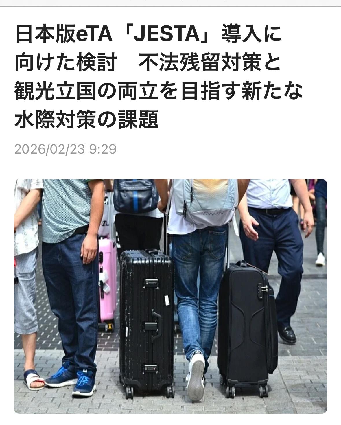 2025年,日本政府公布方针:2028年度内对免短期停留签证国家和地区的入境者适用电子旅行认证制度「JESTA(日本版ESTA)」 日本政府提出的外国人政策中,包含为守护国民安全与安心而强化出入境管理、推进数字化转型(DX)等内容。该制度是一项“事前入境审查”机制,旨在一方面防范随着访日游客增加而令人担忧的犯罪分子、非法滞留者入境,另一方面通过入境审查自动化等方式实现审查高效化、快捷化。 制度设想面向免短期停留签证国家和地区适用,与签证不同,它是一项要求旅行者本人必须办理的认证制度。若未取得认证,旅行者将被禁止搭乘飞机、船舶等交通工具,无法入境日本。 目前相关细节尚未确定,但据媒体报道,费用预计约为3000日元。 关于这个政策目前外界有以下疑问: • 是否日本会同时征收旅客税和ESTA类费用? • 加上旅客税后,入境日本需负担约6000日元,这是否会影响当前火热的外国人访日旅游热情。 • 这是否与日本耗时良久、将免短期停留签证政策覆盖至71个国家和地区的方向背道而驰? • 是否会损害日本的国际形象? —-日本签证申请阶段已经经过严格审核,还要推JESTA(日本版ESTA),实在是有点没事找事。不仅增加访日游客的费用负担,还又多了一个手续。 国际观光旅客税(旅客税财源)的目的与用途 据日本财务省官网介绍,旅客税是“为实现观光发达国家目标、扩充与强化观光基础而确保财源的税种”。 其用途依据《关于通过促进外国观光旅客来访等振兴国际观光的法律》(平成9年法律第91号),限定用于以下3个领域,助力实现2030年访日外国游客6000万人次等目标: 1. 打造无压力、舒适的旅行环境 2. 便捷获取日本多元魅力相关信息 3. 利用地方独有文化、自然等观光资源,提升游客在地体验与停留满意度 日本第五次观光立国基本计划及2026年度观光厅相关预算中,旅客税财源将投入基于上述方向的具体政策,本文对观光厅预算细节不作展开。 —-高市内阁上台后推出这些对在日外国人和访日外国游客很不友好的政策,还不知道是不是会引发一波抵制到底日本旅游的狂潮。不过,日本现在因访日游客年年暴增出现乱扔垃圾交通拥堵等各种问题,日本社会有些人就认为这都是外国游客不好破坏了日本原有的环境。但个人认为这虽然表面上看是大量外国游客引发的问题,但归根结底是日本自己的问题,既然要吸引那么多外国游客,主人自己不准备好却怪客人,这算啥待客之道。