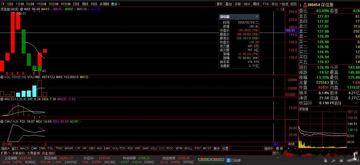 强势普涨。跌幅榜上:华胜天成、大位科技、三花智控等个股大跌。大跌原因:主要个股:基本面恶化、高估值修正与资金集中流出共同驱动。与此同时:美国2月14日呼吁收紧对华半导体出口管制的传闻持续发酵,叠加证监会强化“伪市值管理”打击,间接压制:高换手、高估值科技股情绪。