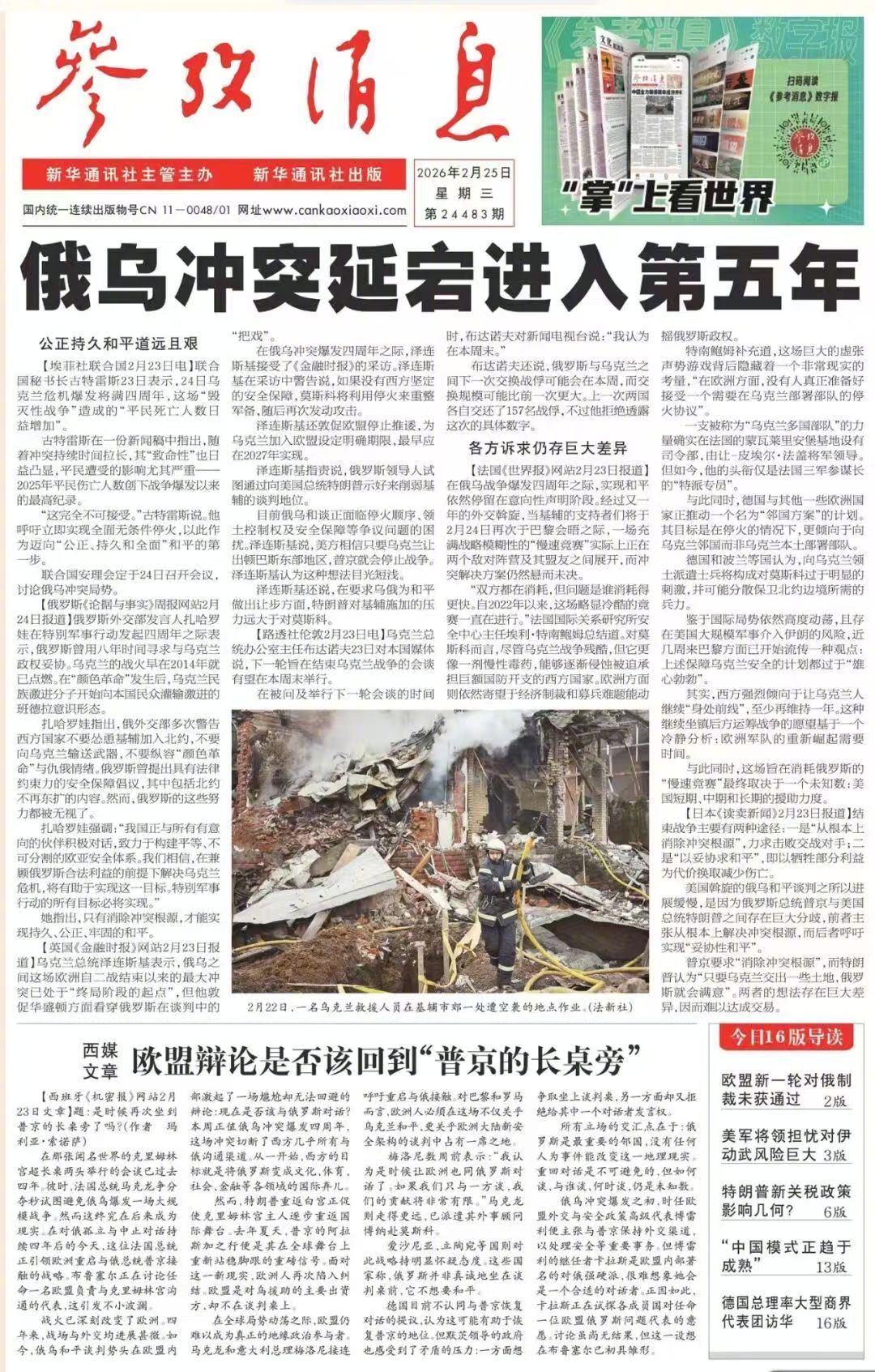 今日报纸头版:①#俄乌冲突#延宕进入第五年②西媒文章:欧盟辩论是否该回到“普京的长桌旁”更多消息请关注→网页链接