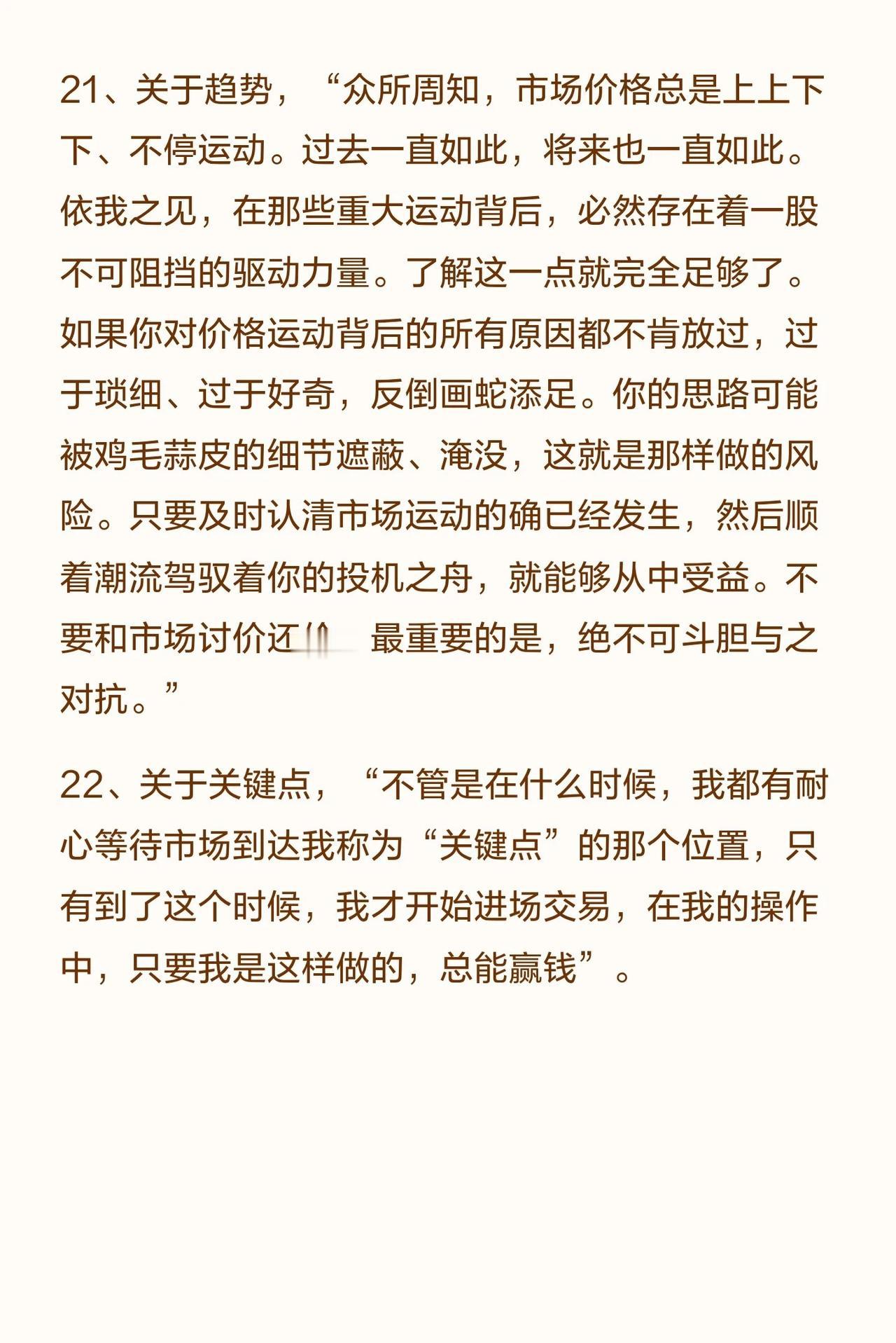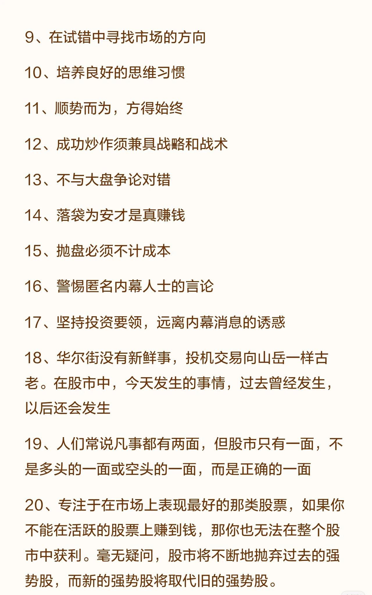 《股票大作手回忆录》的核心炒股智慧,可总结为以下要点: 1. 心态与原则:尊重市场,不怒不争,坚持独立思考,只认“正确”这一面,远离内幕消息。 2. 趋势与策略:深刻理解并顺应市场主要趋势,不与趋势对抗。操作上需战略与战术兼备,专注强势股。 3. 时机与执行:耐心等待“关键点”再出手,在试错中找方向。该买则买,该抛时须不计成本,且要懂得落袋为安。 4. 核心本质:市场万变不离其宗,历史总在重演。建立并坚守自己的操作体系,是持续盈利的关键。