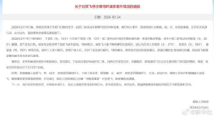 #平顶山再通报15岁女孩被打事件#【关于刘某飞等涉嫌寻衅滋事案件情况的通报】郏县人民政府关于刘某飞等涉嫌寻衅滋事案件情况的通报:2026年2月19日晚,郏县茨芭镇卫生院门口路段发生一起因二轮电动车相撞引发的寻衅滋事、殴打他人案件,造成恶劣社会影响。省、市、县高度重视,公安机关迅速行动、全力侦办,现将案件进展情况通报如下: 2026年2月19日19时40分,丁某乐(女,15岁)与其弟丁某洛(男,12岁)骑二轮电动车到茨芭镇东坡东路一零食店购买零食,途中与骑二轮电动车的杨某(女,65岁)碰撞,双方发生口角。杨某电话联系其子刘某飞前来现场。19时45分,刘某飞与妻子韩某娜到达现场后,误认为在场人员郭某(女,27岁)、张某凡(女,38岁)、薛某源(男,15岁)辱骂其母,遂对三人进行殴打。发现打错人后,又对丁某乐进行殴打。19时48分,郏县茨芭派出所接派警后,迅速出警赶赴现场进行处置,将刘某飞和韩某娜传唤至派出所进行调查。 事发后,受害者被送往郏县中医院就诊。2月22日,丁某乐经鉴定构成轻伤二级,目前正在接受治疗,伤情稳定;薛某源经门诊诊治无需住院于2月20日离院;郭某、张某凡经住院治疗于2月23日出院。 经查,犯罪嫌疑人刘某飞,男,42岁,郏县茨芭镇刘村人,个体工商业者;韩某娜,女,42岁,郏县茨芭镇刘村人,无业。2月21日,郏县公安局对犯罪嫌疑人刘某飞、韩某娜采取刑事强制措施;2月24日,郏县人民检察院以涉嫌“寻衅滋事罪”对刘某飞、韩某娜批准逮捕。 下一步,我们将坚持零容忍,对侵害未成年人、扰乱公共秩序等违法犯罪行为,坚决依法惩治,绝不姑息。真诚感谢媒体和网民对我们工作的监督和支持。(新华社)#平顶山再通报打人事件#