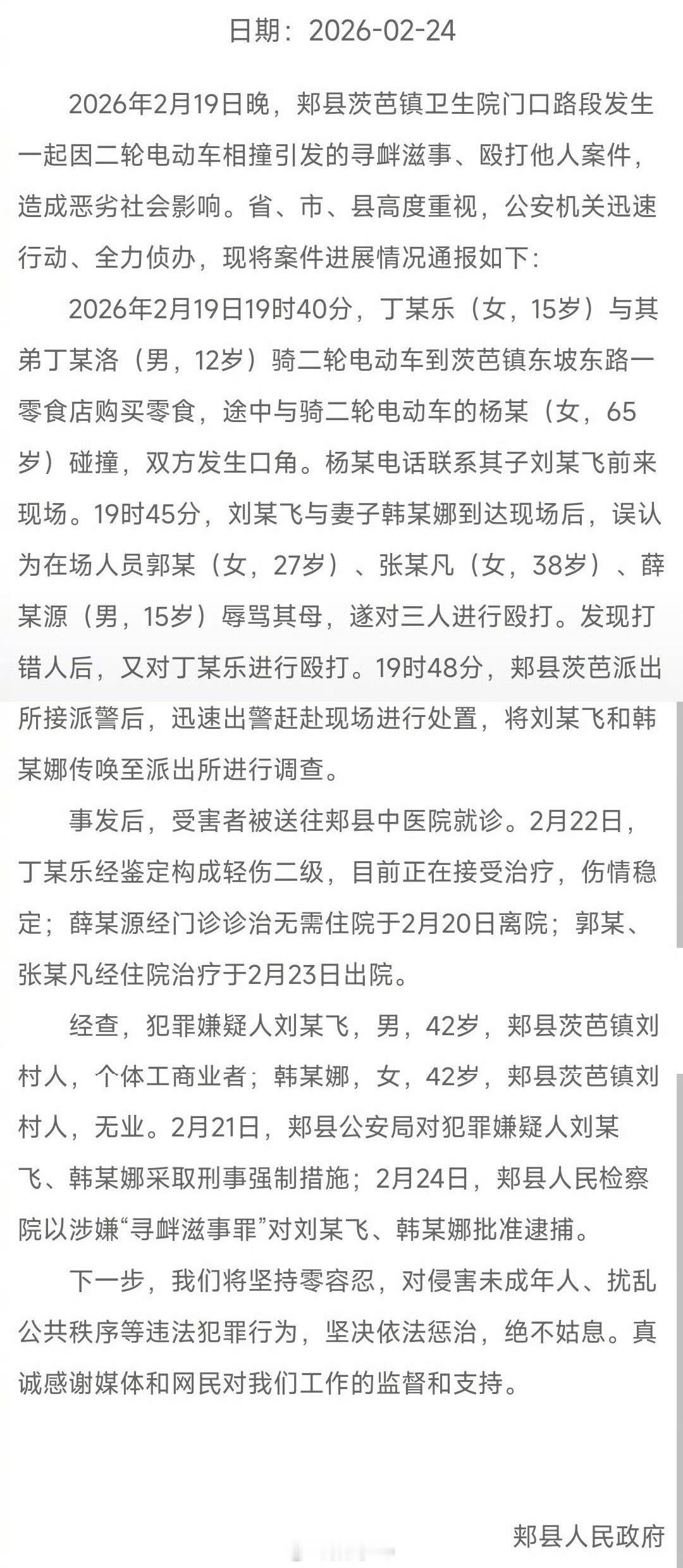 平顶山再通报打人事件2026年2月19日,郏县刘某飞夫妇因电动车碰撞纠纷,误打他人后又殴打15岁少女致其轻伤二级,2月24日被以寻衅滋事罪批准逮捕。看了当时的视频,小女孩被打的这么狠,周边也没有帮忙的,有的时候真是太冷漠了。最后说一句:一定要严惩。