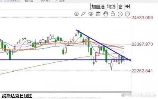 第一,昨天晚上美股三大指数全线反弹,其中纳斯达克指数涨1.04%。根据莎哥观察虽然昨天晚上美股三大指数全线反弹,但是美股依然没有形成关键的技术突破,以纳斯达克指数为例,纳斯达克指数并没有向上突破近期的下降压力线。如果今天晚上美股不能继续反弹,反而出现再次调整,那么美股就有可能出现加速下行的走势。大家请看下图——纳斯达克指数日线图。