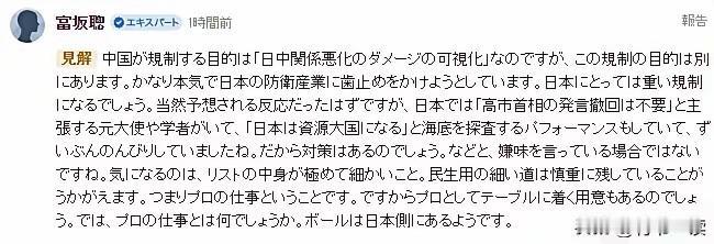 日本教授看得明白:中国不是报复,是给日本划红线! 2月24日,日本教授富坂聪一语道破:中国对日本40家实体实施出口管制,不是情绪化报复,而是精准踩刹车。这话很实在,也说到了点子上。 中方目的很清楚,一是约束日军工扩张,二是保留对话空间,冷静又专业。 中国出手很有分寸:只卡军工、不害民生,既压制日本军事扩张,又保留对话通道,冷静、专业、有理有据。 2023年以来,日本这些年跟着美国在高科技、半导体上频频使绊,还不断推动军事扩张,多次收紧半导体设备出口管制,限制高端技术对华出口,严重影响我国产业链安全。中国这次反制,是依法维护自身利益,更是对日本不断挑衅的必要回应。 我们一直保持克制,不是没脾气,而是给日本留足机会。但如果日方继续执迷不悟,在军事扩张、科技围堵上越走越远,那后续的管制只会越来越严。 中方始终留着谈判通道,前提是日本必须停止危险动向,回到理性轨道上来。如果继续装悠闲、不珍惜机会,后续限制只会越来越严,到时候想谈都没那么容易。 大国博弈,拼的不是嗓门,是底线与实力。 不挑事、不怕事,你友好我开放,你挑衅我必反制。 希望日本能听懂,别等到无路可退,才后悔没有珍惜机会。 中日关系 出口管制 大国底线 中方对日本表态