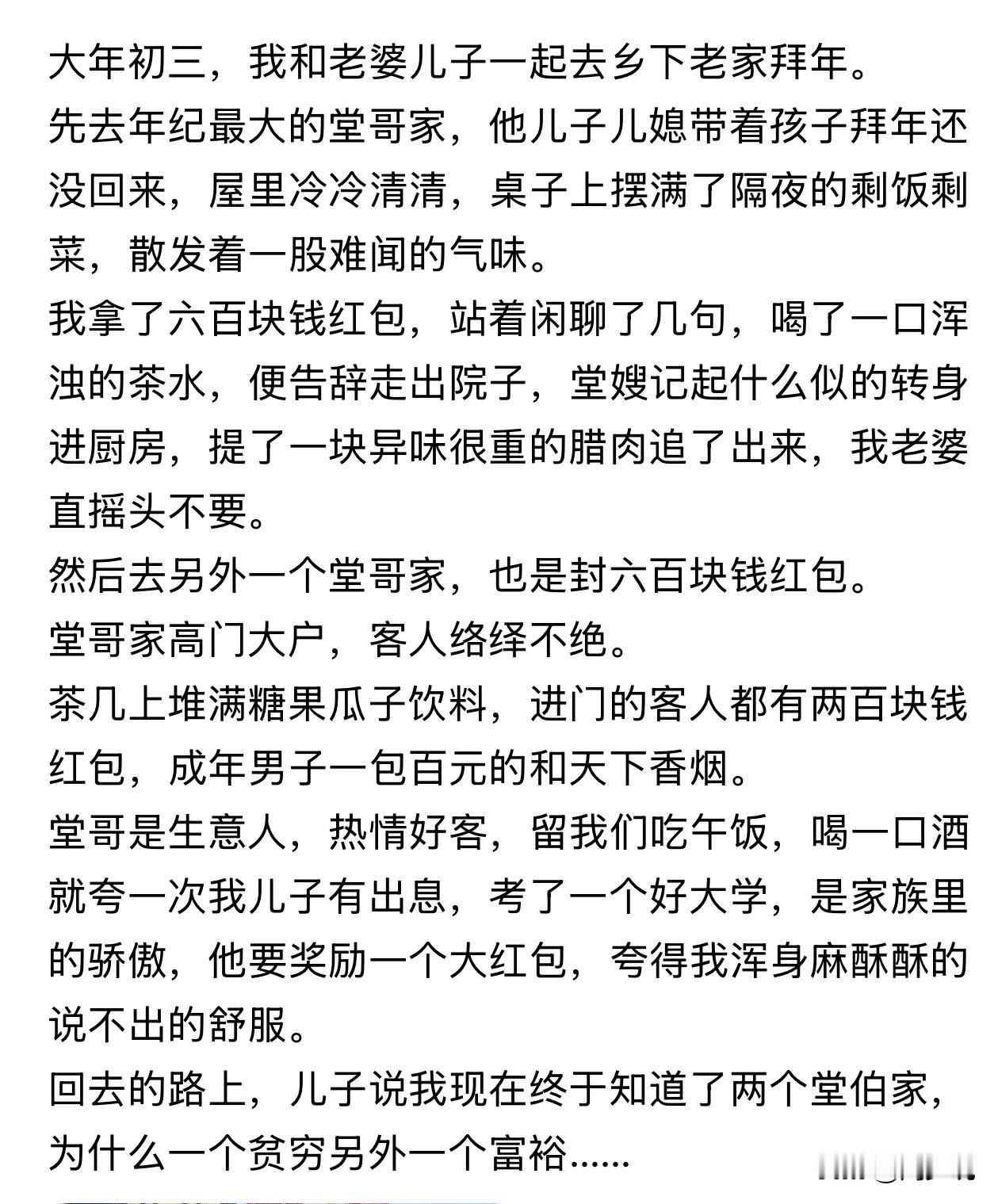 “太真实了!”网友爆料:带着老婆儿子去乡下老家拜年,先是年纪最大的堂哥家,屋内冷清,桌上堆着隔夜饭,递上六百块红包,坐了没几分钟,喝了口茶水就准备走。堂嫂后来追出来,递来一块味道很重的腊肉,妻子委婉拒绝了。 转头去另一个堂哥家,高门大院,来往客人不断,来客都有红包,男宾还能领到好烟。堂哥做生意,待人热情,一直夸儿子考上好大学有出息,还要额外给大红包。此番对比这下,让儿子都忍不住感慨道:“我总算明白,为啥两位堂伯家一个穷、一个富了。” 此事在网上曝光后,有网友感慨:“穷和富的差距,从来不是钱,是待人接物、生活态度的差距”。 也有人说:“孩子一眼看透的道理,大人却常常想不明白”。 在周少看来,其实这件事,更值得我们放在教育里琢磨。孩子的观察力,远比我们想象的敏锐,贫富的外在差距只是表象,真正拉开人生距离的,是生活里的细节、待人的格局,还有经营生活的能力。 我们总想着教孩子考高分、学技能,却常常忽略,生活态度、处事方式、待人的热情与体面,这些看不见的东西,往往会影响一个人一生的走向。 孩子在耳濡目染里看懂差距,远比我们讲一百句大道理都管用。比起物质的给予,教会孩子热爱生活、体面待人、用心经营日子,这才是更重要的人生一课。#寻美三湘# #周少说教育#