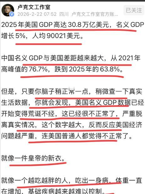 著名国际问题专家卢克文怒斥美帝的GDP泡沫,30.8万亿,皇帝的新衣罢了! 这可真是太荒唐了,美帝越来越越不正常,离了大谱!! 说白了,美帝那30.8万亿的GDP就是穿在身上的皇帝新衣,看着唬人,扒掉那些虚头巴脑的水分,连件像样的遮羞布都没有,卢克文这怒斥,简直说到了点子上! 首先得说统计口径里的猫腻,美国用的是支出法核算,不管是不是真有实际产出,只要有货币流动就往GDP里算。 最典型的就是自有住房虚拟租金,居民住自己全款买的房子没花租金,却要按市场价格虚拟一笔收入计入GDP,光这一项就占了GDP的6.7%,相当于近2万亿美元的水分,快赶上中国农业增加值的总量。 还有研发资本化和金融投机收入,美国把大量没转化成实际生产力的研发投入算进去,金融机构的股票债券衍生品交易收益也全纳入统计,这些账面操作直接让GDP数字虚胖一大圈。 反观中国采用生产法,只统计真实产出和增加值,避免了这种无中生有的数字膨胀,两者统计逻辑的差异,从根上就让美国GDP的含金量打了折扣。 而医疗领域的泡沫更是离谱,美国医疗支出占GDP比重接近18%,每6美元GDP里就有1美元来自医疗,规模比德国、日本全国GDP还大。 但这不是民生保障到位,而是资本垄断下的畸形产物,药企垄断定价、医院漫天要价、保险公司层层抽成,一场普通手术就能开出上万美元账单,所有虚高成本最后都变成了GDP数字。 更讽刺的是,花这么多钱却没换来对应的民生福利,数千万人医保不足,六成个人破产源于医疗费用,人均预期寿命还低于发达国家平均水平,这种用民众血汗钱撑起的GDP增长,完全是本末倒置的泡沫。 产业结构的空心化更是让这份GDP失去了实体支撑,美国制造业占比仅10%左右,工业增加值也才12.83%,而服务业占比超80%,其中三分之一以上是虚拟经济或重复计算。 经济增长几乎全靠虚拟领域拉动,2025年上半年AI投资占GDP增长的92%,剔除这一领域后其他产业增长率仅0.1%,相当于整个经济都押在单一虚拟领域。 这些AI投资大多集中在数据中心建设,没有转化为实体经济的生产力,反而导致就业流失和生产率虚增。 金融衍生品交易、股市泡沫带来的收益被大量计入GDP,外国投资者涌入美股推高的资产增值,既不能解决基础设施老化问题,也无法提升普通民众的实际收入,只是不断放大数字幻觉。 高通胀更是让名义GDP的水分雪上加霜,美国CPI和PPI曾长期高位运行,物价上涨直接推高了名义GDP数值,但居民实际购买力却在下降。 同样的钱买的东西变少,生活成本持续上升,这种靠通胀堆出来的GDP增长,对民众来说没有任何实际意义,反而加剧了贫富差距。 更关键的是,美国GDP中虚拟经济成分占比高达42.4%,近一半增量来自不创造实际价值的账面活动,这种结构导致经济抗风险能力极差,一旦虚拟领域出现波动,整个GDP体系就面临大幅缩水的风险。 所谓30.8万亿GDP,本质就是把民生刚需、虚拟交易、账面操作全都打包算进去的数字游戏。没有坚实的制造业支撑,没有合理的产业结构,更没有对应的民生改善,只是靠统计规则的灵活运用和虚拟经济的泡沫膨胀撑起的虚假繁荣。 就像皇帝的新衣,表面光鲜亮丽,实则空空如也,一旦泡沫破裂,这些虚高的数字会迅速褪色,露出经济空心化、民生保障薄弱的真实面目。这种脱离实际的GDP增长,既不能反映国家真实经济实力,也无法给民众带来切实利益,不过是自欺欺人的数字狂欢。
