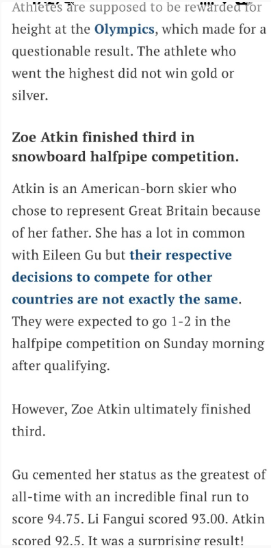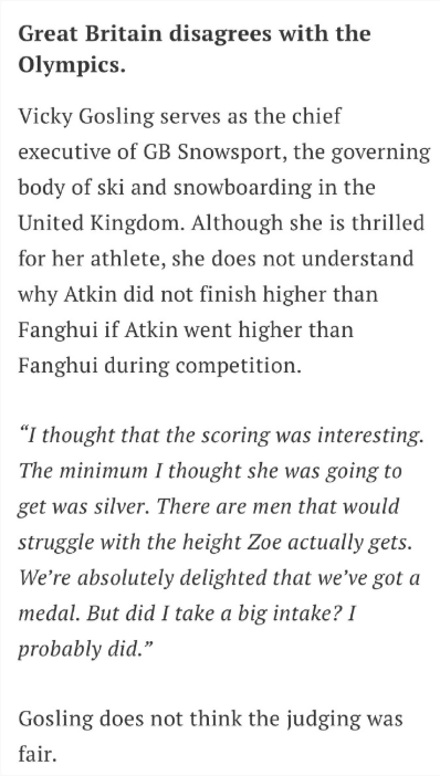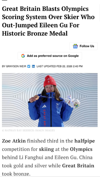 英国选手腾空高度远超谷爱凌却仅获铜牌 近日,英国滑雪协会就2026年米兰冬奥会女子自由式滑雪U型场地技巧项目的打分系统提出质疑。决赛中,英国选手佐伊·阿特金腾空高度达5米,高于谷爱凌与中国银牌选手李方慧,最终却以92.50分获得铜牌。 谷爱凌以94.75分成功卫冕,李方慧凭借93.00分摘得银牌。英国滑雪协会首席执行官认为,阿特金的表现至少应获银牌,打分未充分体现其竞技水平。