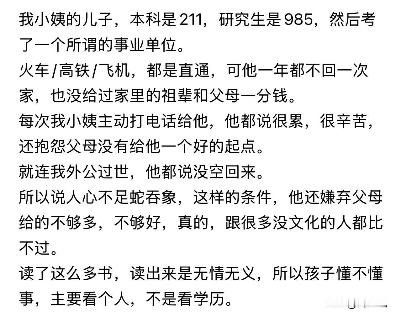 “这书真是白读了!”一位网友吐槽:小姨的儿子,本科211,研究生985,顺利考上事业单位,在旁人眼里,已是妥妥的“天之骄子”。可学业再优秀,人品却让人寒心。交通再方便,他一年也难得回一次家;工作稳定收入不低,却从没给过父母、祖辈一分钱。每次小姨主动打去电话,换来的只有“很累、很忙”,甚至还抱怨家里没给他好的起点、好的资源。最让人无法接受的是,外公去世,他一句“没空”,连最后一面都不愿出现。 此话一出,不少网友看完纷纷直言:“学历再高,不懂感恩,也是白搭。” 还有网友更是坦言:“知识可以改变命运,但改不了人心。” 在周少看来,其实我们一直都在误区里打转,总以为孩子成绩好、学历高,未来就一定差不了。可很多时候,高学历只是多了一层光环,未必能教会一个人善良与孝顺。 书读得再多,不懂得体谅父母辛苦,不珍惜亲情,不懂得感恩,走到哪里,都很难称得上真正的优秀。这样的孩子,即便拥有再亮眼的履历,也容易变得自私、凉薄,甚至把所有不如意都推给家人。 所以,各位家长不妨想一想,我们养孩子的初衷是什么?不是为了面子,不是为了炫耀学历,而是希望他知冷暖、懂感恩、有担当。 知识可以慢慢学,但人品和教养,从小就要扎根。真正的教育,从来不止分数和名校,藏在骨子里的善良与孝心,才是一个人最硬的底气。#寻美三湘# #周少说教育#