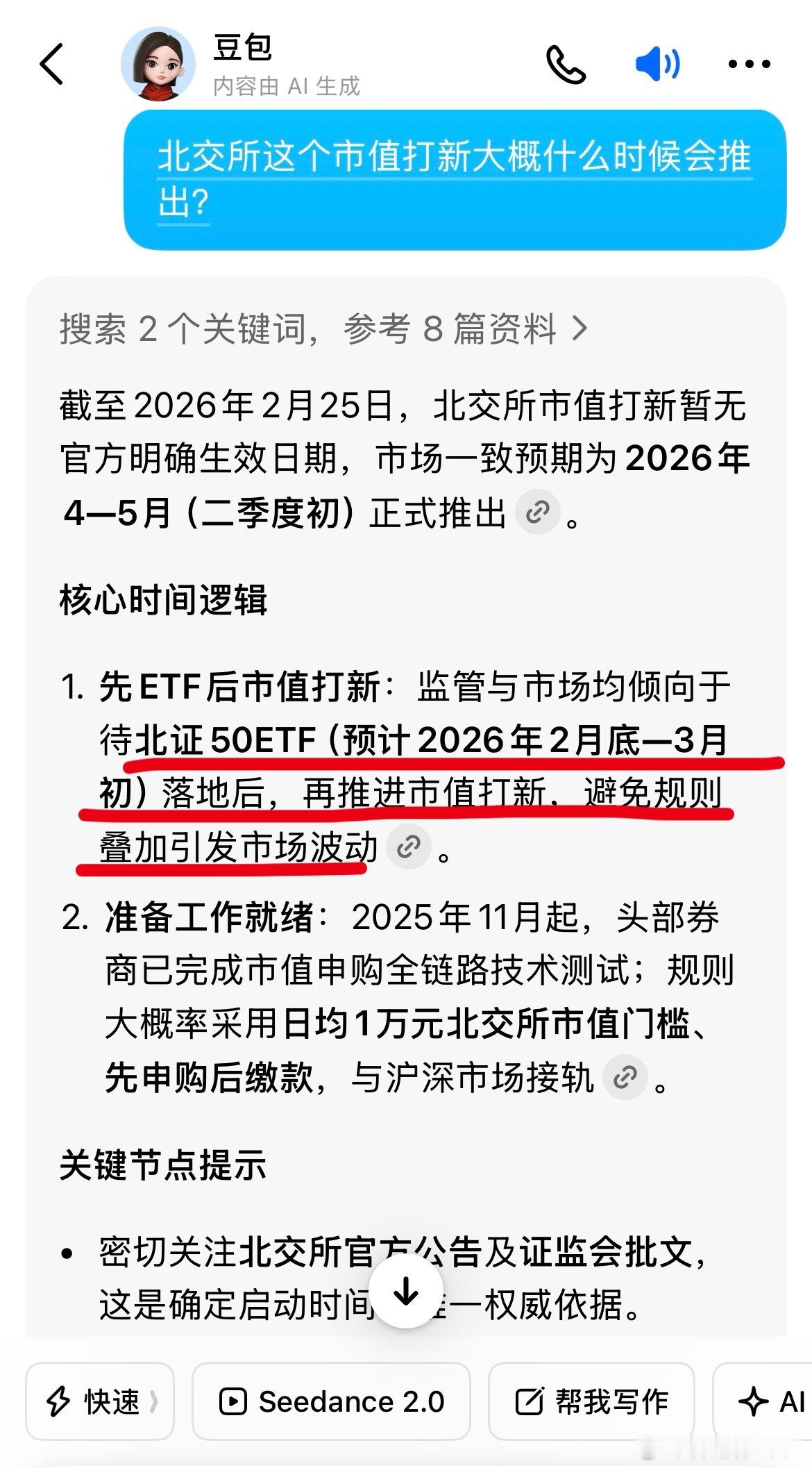 就这个北证走的萎靡,问了一下豆包,说北证50ETF,二月底三月初会落地,怎么一点反应都没有?这是哪里喂的数据,准确吗?