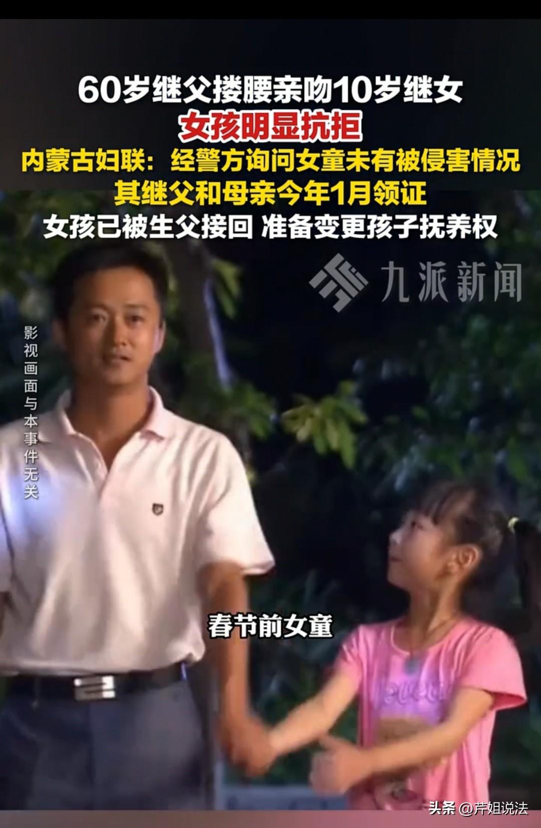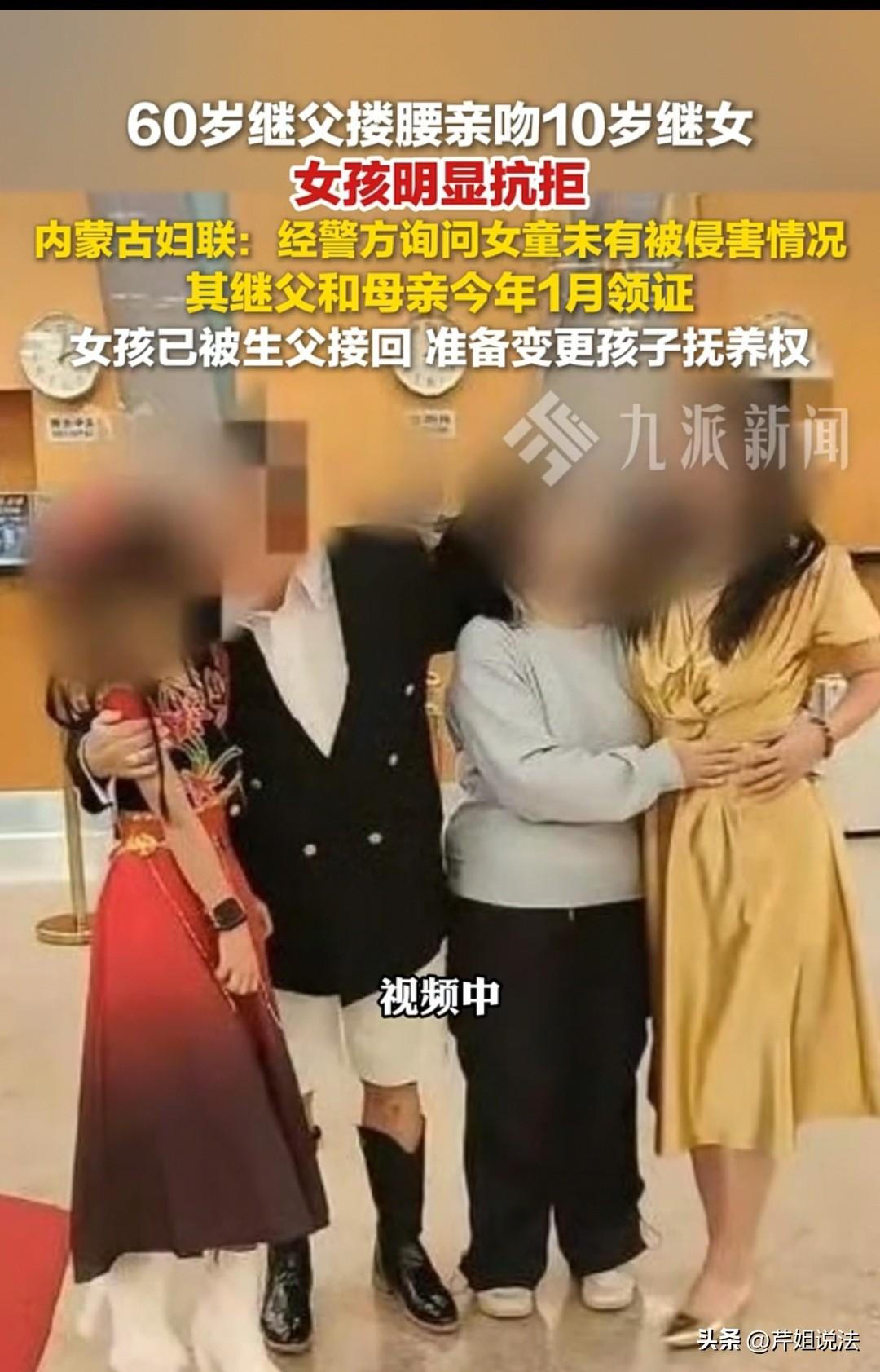 内蒙古,一名60多岁的继父,搂着10岁女童拍摄短视频,画面让网友十分担心女童受到伤害,大家随即联系了妇联。女童40岁的母亲表示,他们只是拍着玩,并没有伤害女孩,女童也回应自己非常安全。不过过年期间,女童与母亲、继父发生小矛盾,便联系了亲生父亲。父亲得知情况后,连夜从江苏赶到河北,将女童接回包头,并表示会变更抚养权,妇联也将持续关注并协助父亲办理后续变更流程。 2025年9月16日,不少网友刷到一条视频:一个小女孩在玩玻璃瓶,瓶身折射出身后有成年人裸露身体。 起初大家没太在意,但出于谨慎,网友翻看了该账号主页,发现了更多让人不安的内容。 这是一个60多岁男子的账号,里面有多张他搂着这名女童、亲吻脸颊的照片。就算是亲爷爷、亲外公,面对10岁左右的孩子,也该注意分寸,更何况是继父。 视频里,小女孩被搂住时明显有反抗、抗拒的举动,说明她内心并不愿意。还有一段视频中,小女孩穿着连衣裙短裙,还踩着高跟鞋,打扮过于成熟,颠覆了大家的认知。 网友们立刻联系妇联反映情况,希望核查这名男子与女童的关系,即便有40多岁的女子陪同,大家依旧放心不下。 妇联尝试联系账号主人,未能成功。记者介入后联系上女童母亲,母亲解释,60岁男子是她的二婚丈夫,两人1月份刚领证,女童是她和前夫的孩子,搂抱、拍照只是为了拉近感情,闹着玩而已,不会影响女儿。 此事暂时告一段落,但妇联、记者和网友都没有放下警惕,持续关注事态发展。2月24日,记者联系上女童生父,带来了好消息。 今年过年,女童随母亲和继父回河北过年,期间发生矛盾,她想念父亲,便给在江苏打工的生父打了电话。 生父此前已了解相关情况,一直牵挂女儿,接到电话后立刻赶往河北,将女儿带回包头老家。 他察觉到女儿在母亲与继父身边的生活环境不佳,存在安全隐患,决定将女儿的抚养权变更到自己名下。 妇联工作人员表示,孩子跟随生父生活安全系数更高,愿意持续关注,并协助生父办理抚养权变更手续。 网友们这才松了一口气,可预见的伤害被降到最低。 大家也希望小女孩能平安长大,今年她才10岁,距离成年还有8年,无论跟着父亲还是母亲,都能得到用心呵护与照顾。 等她成年,有了自主选择权和自我保护能力,大家才能真正放心。 那么,60岁继父搂抱、亲吻女童的举动,是否构成对女童的冒犯?即便女童表示继父没有做出格行为,在法律上,这种年龄差与亲属关系,能否认定为不合适? 《刑法》第二百三十七条:以暴力、胁迫或者其他方法强制猥亵他人或者侮辱妇女的,处五年以下有期徒刑或者拘役。 聚众或者在公共场所当众犯前款罪的,或者有其他恶劣情节的,处五年以上有期徒刑。猥亵儿童的,处五年以下有期徒刑;有下列情形之一的,处五年以上有期徒刑:(一)猥亵儿童多人或者多次的;(二)聚众猥亵儿童的,或者在公共场所当众猥亵儿童,情节恶劣的;(三)造成儿童伤害或者其他严重后果的;(四)猥亵手段恶劣或者有其他恶劣情节的。 本事件中,继父与10岁女童存在巨大年龄差,且无血缘关系,其搂抱、亲吻行为已超出正常亲情边界,结合女童明显抗拒的反应,可认定为对未成年人的不当身体接触,具有冒犯性。 虽暂无证据证明构成猥亵儿童罪,但该行为违反未成年人保护的基本原则,不符合儿童身心健康发展需求。 未成年人身心发育不成熟,对亲密接触缺乏完整判断与反抗能力,法律对未成年人身体边界、隐私保护实行特殊优先保护。 即便监护人声称“开玩笑”,也不能成为突破身体边界、忽视儿童意愿的理由。 对于此事,大家如何看?素材来源于深圳新闻网网