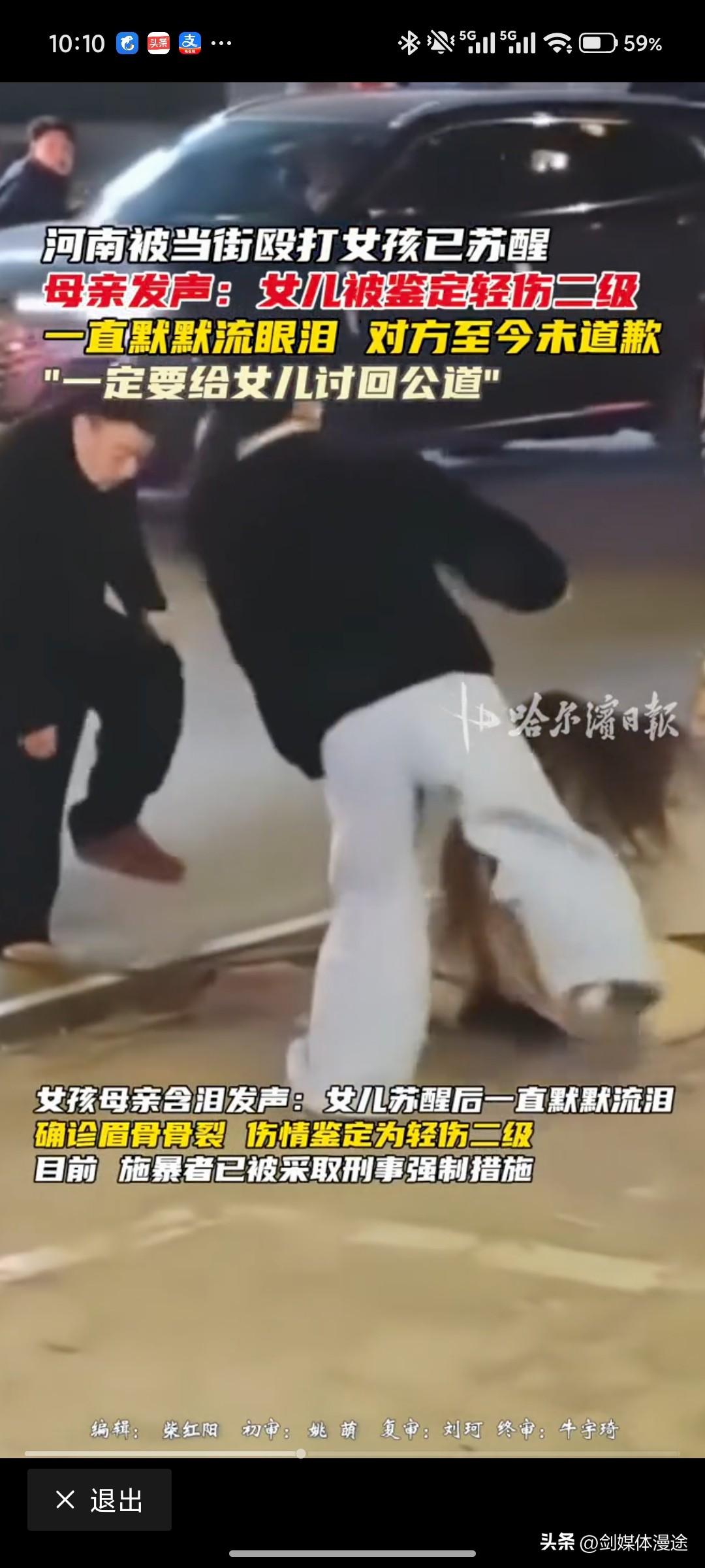 平顶山“打人”事件 肇事者想用“钱”和解,受伤者不签 拒绝和解,违法就得负法律责任,钱不能替法!平顶山县人民政府通报:刘某飞夫妻涉嫌“寻衅滋事罪”被批捕! 发生在 2026 年 2 月 19 日 的晚上,丁某乐(女,15岁)与其弟丁某洛(男,12岁)骑二轮电动车到茨芭镇东坡东路一零食店购买零食,途中与骑二轮电动车的杨某(女,65岁)碰撞,双方发生口角,杨某电话通知其子刘某与儿媳韩某到达现场并对丁某乐进行了殴打 ,最后受伤者丁某乐送医并经鉴定构成轻伤二级。 视频画面中男子用拖鞋狠狠抽女孩的脸,拿起路边的砖头就往孩子头上砸,打累了,女子就上前补刀,踹肚子、踢肋骨、扇耳光,如此在春节期间对待一个未成年 15 岁的女孩子,于心何忍呢? 对于路过的行人 及劝导人员 也被这一对夫妇殴打。 如今视频中的一对男女夫妻身份扒出来后,发现平日里这一对夫妻就是人品不好 横行霸道,口碑极差,男的有前科,出来后更加的嚣张,毫无长记性! 面对法律制裁之时,这样的一对人还想与受伤者家庭“和解”以赔偿了事?品行如此恶劣 ,同时又是在当街众目之下行恶,这样的败行怎么就可以“赔偿”了事呢?想将法律当成摆设吗?人民不同意 受伤者家庭也不同意,法律也不允许 让这种人逍遥法外! 这种总以为“用钱”了事的,也发生在最近一个交通违法案件中,两位有钱人 一个开着牧马人 一个开着保时捷 公然在市政大道上 开斗气车 市政道路最高时速 60 公里,这两部豪车狂飙到 150 公里,还要不断闯红灯 ,跨实线变道 根本就没有将交道法及路上的行人及其它车辆的安全放在眼里,眼中以为自个是豪车 有钱人 斗气,最后被交警强行拦截后 还想以“钱”了事,最后交警将其带回交警队 明确告诉车主 违法犯罪 钱解决不了任何问题,如果路上的行人或其它车辆被撞出人命了,你们想过后果吗?你们以为有钱就可以“买命 买通法律吗”?最后数罪并罚 重考 吊销驾照 等相关处罚! 而对于平顶山打人 及交通违法 这些人 总以为身上有钱 就可以了解,无视法律 无视生命 将法律当成个人之法,总以为有钱就是万能! 2 月 24 日 河南平顶山郏县再通报打人事件:刘某飞夫妻涉嫌“寻衅滋事罪”被批捕! 针对此事 ,社会反响相当的激烈 都是正义的声音: 寻衅滋事罪包含随意殴打他人情节恶劣的行为。随意殴打未成年人造成恶劣社会影响,符合该罪认定标准。 网友质疑打人者公然施暴,性质恶劣,疑似恶霸行径。 网友支持被打孩子家长,呼吁追查到底,要求公开处理。