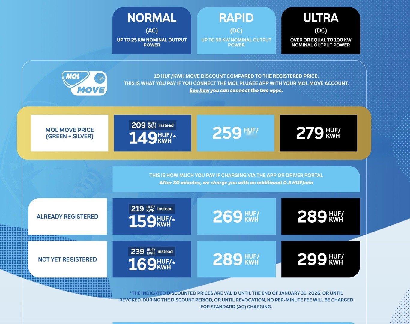 如果你是 MOL Move 会员,价格最划算,每度电大概 149–279 福林,按现在汇率折合人民币 3–6 块钱左右。但充电超过 30 分钟,每分钟还要额外收 0.5 福林的超时费。